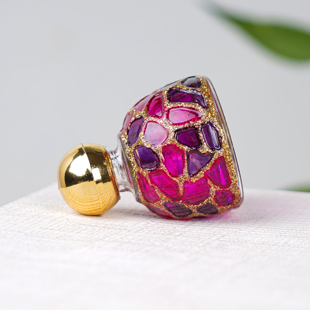 This glass bottle is a beautiful work of art handmade by skilled Indian craftsmen. The combination of purple and pink colours with golden sparkles carved in its glass makes it a unique and eye-catching piece. The golden colour knob used to close the bottle adds a touch of elegance and sophistication. This custom perfume bottle is not only a functional item for storing your favourite fragrance or oil, but also a beautiful decorative piece that can be placed on a table or shelf to add a pop of colour to any room. Its intricate design carved on the glass creates a mesmerizing effect when the light reflects off the golden sparkles. This cute perfume bottle is also a perfect gift for your family, friends, or relatives for special or festive occasions. The engraved perfume bottle adds a personal touch and shows that you put thought and effort into choosing a meaningful gift.