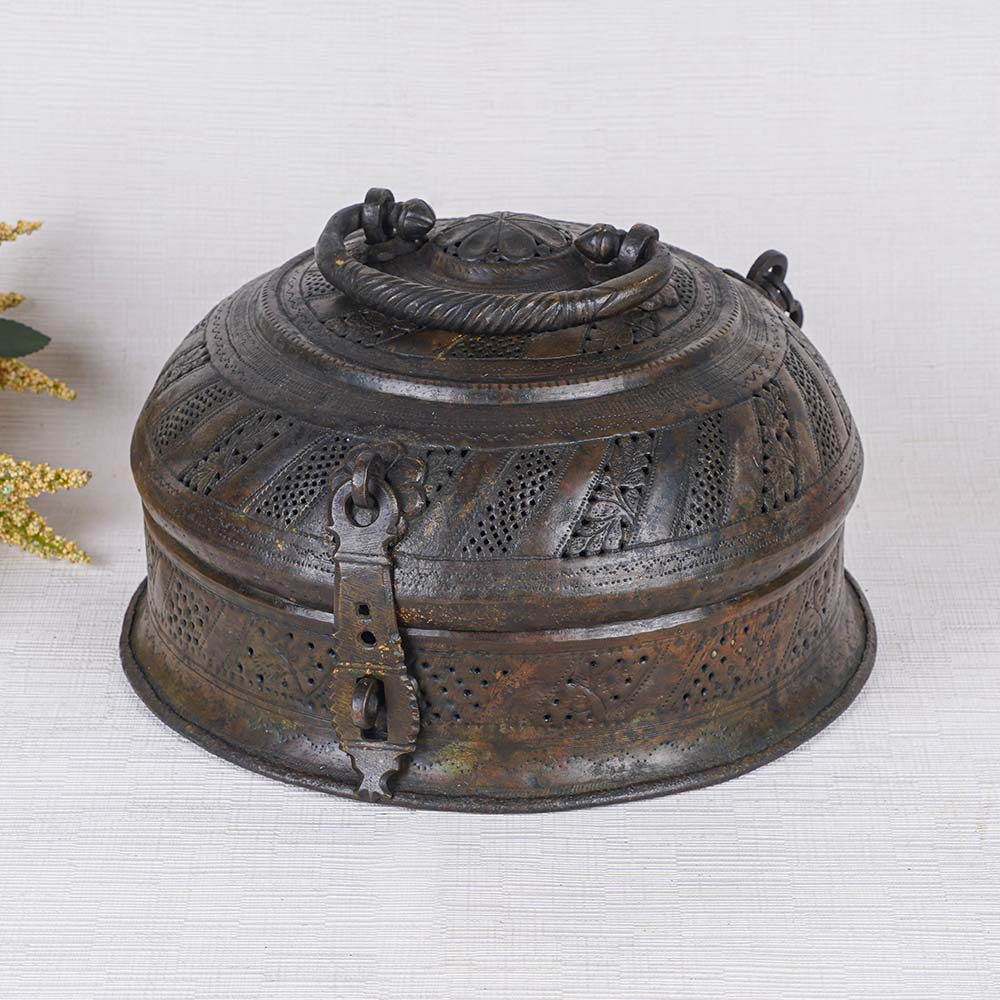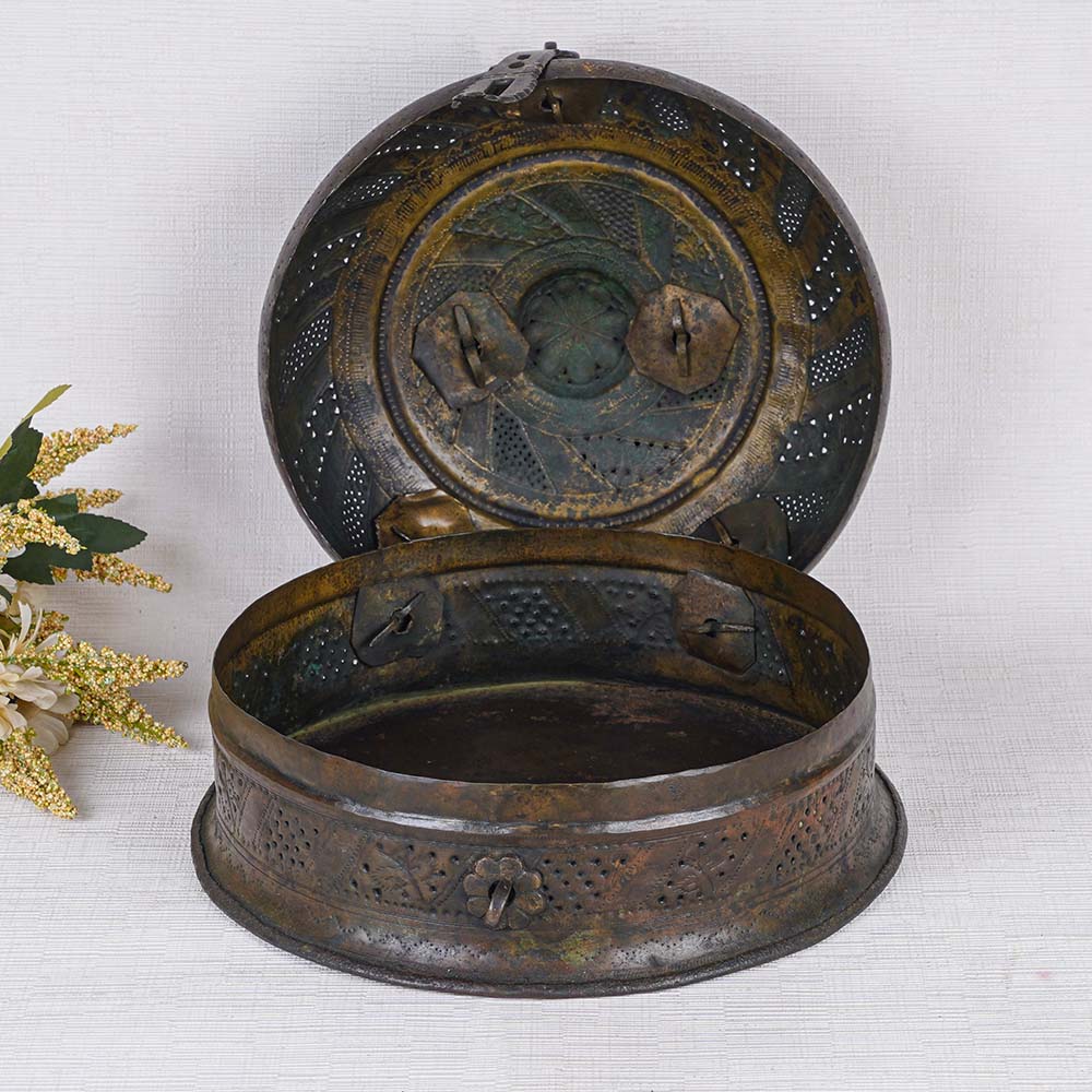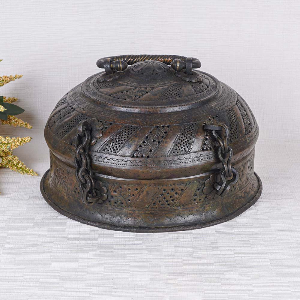 This handcrafted brass round jewelry box is a stunning piece of art created by skilled Indian craftsmen using traditional techniques. Made from high-quality brass, it features a rich dark brown finish that exudes elegance. Originally used to store precious items and jewelry, this versatile box is now a perfect storage solution for your jewelry or precious stones. The jewelry box showcases exquisite engravings, adding a touch of beauty and sophistication. It is equipped with a secure latch for locking and a convenient handle on the top, allowing you to carry it with ease. This versatile box is not only functional but also makes for a captivating decorative piece that can enhance the ambiance of your home, office, restaurant, or hotel. With its impeccable craftsmanship, this jewelry box can be proudly displayed at exhibitions or museums. It also makes a thoughtful and luxurious gift for your family, friends, or relatives on special occasions or festive celebrations. Whether you're looking for a jewelry box, a girl's jewelry box, or a luxury jewelry box, this brass round jewelry box is sure to delight with its timeless beauty and craftsmanship.