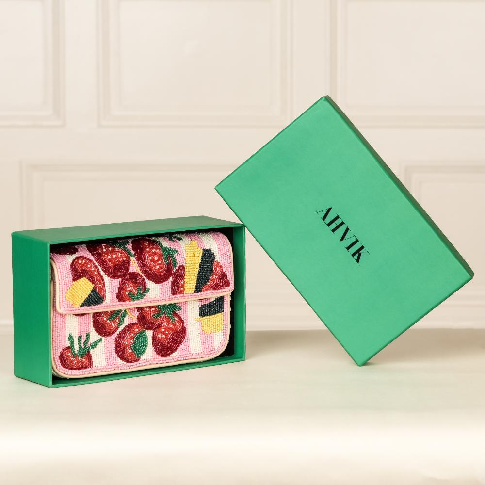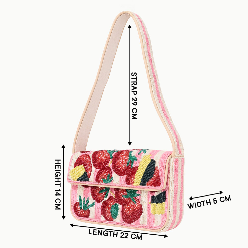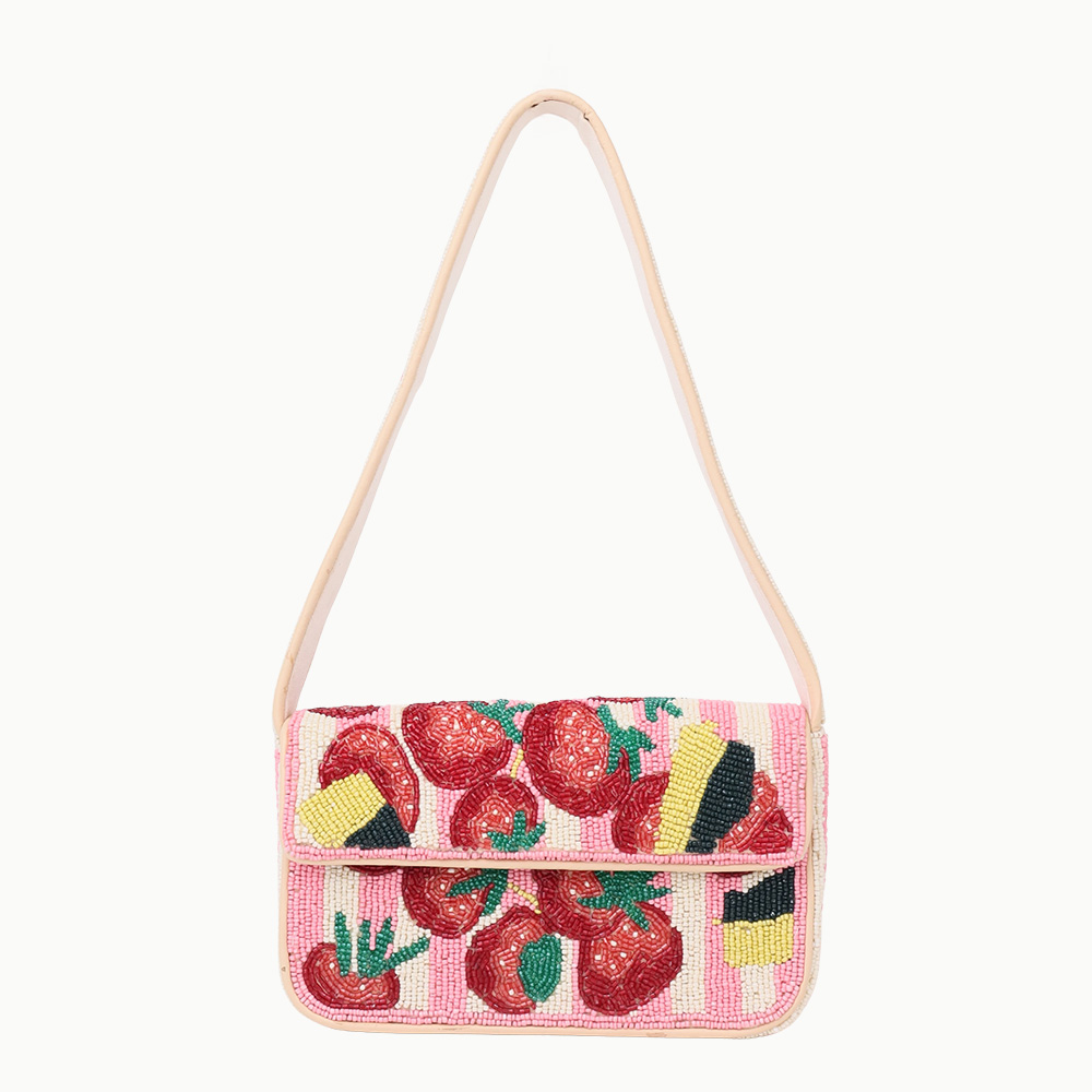 Add a fun and fresh touch to your collection with this luxury beaded shoulder bag featuring a vibrant strawberry design. Handcrafted with precision, this bag combines playful colors and detailed beadwork to create a unique accessory. Its compact yet practical design makes it perfect for parties, brunches, or casual outings where you want to stand out with a bold statement piece. The pink striped base paired with red strawberries and artistic detailing gives it a refreshing and lively appeal.