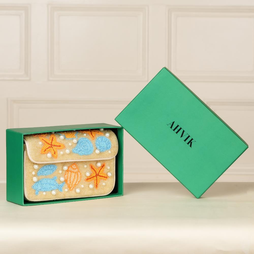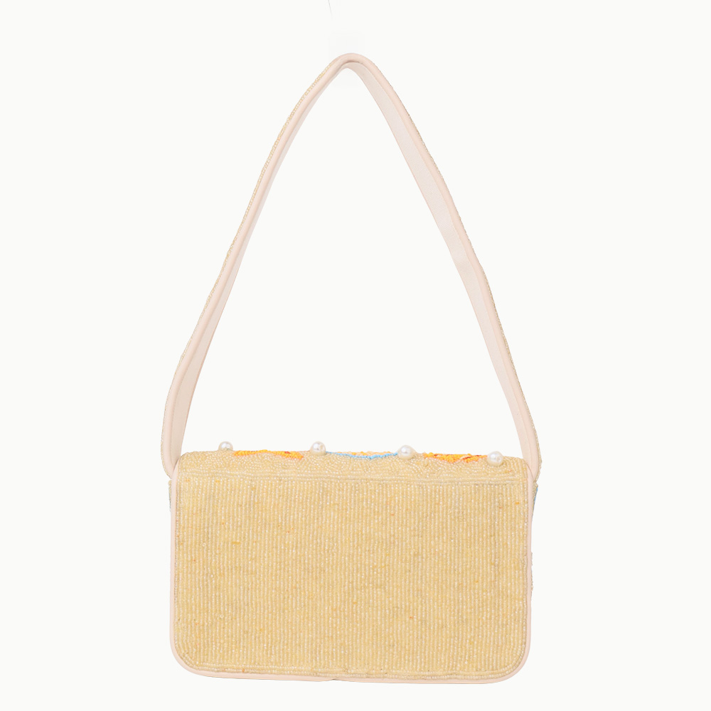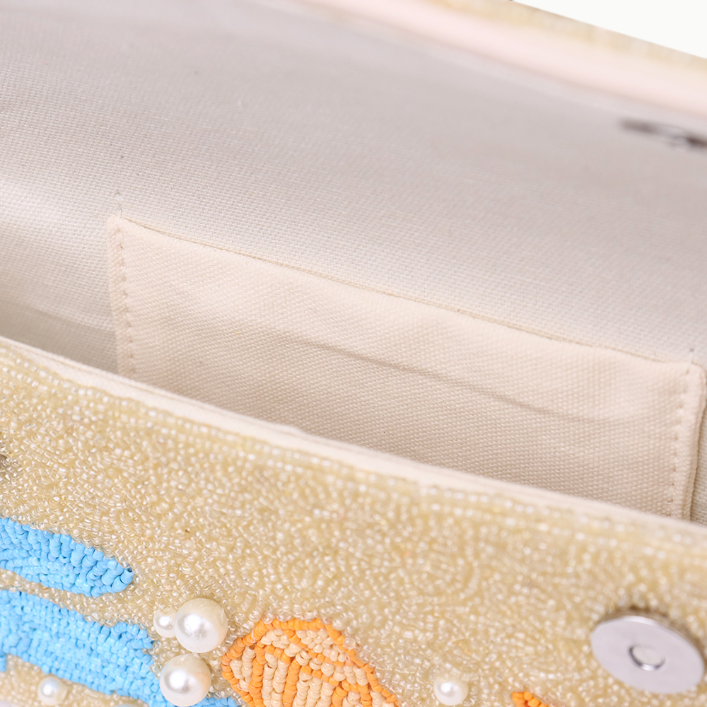 This luxury colorful beaded shoulder bag is inspired by the beauty of the ocean, featuring hand-embroidered seashells, starfish, and aquatic motifs in vibrant shades of orange, blue, and yellow. Adorned with delicate pearls, the bag combines beachside charm with high-end craftsmanship. Perfect for vacations, casual outings, or as a standout fashion accessory, this bag offers both style and elegance. Its premium quality and artistic detailing make it a must-have for those who love unique, handcrafted fashion pieces.