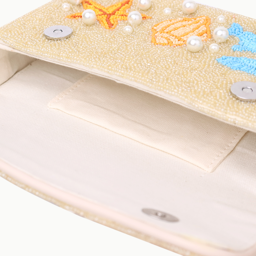 - Pattern: Hand-beaded design with ocean-inspired motifs including seashells, starfish, and fish.