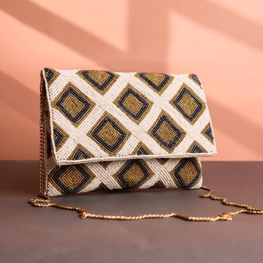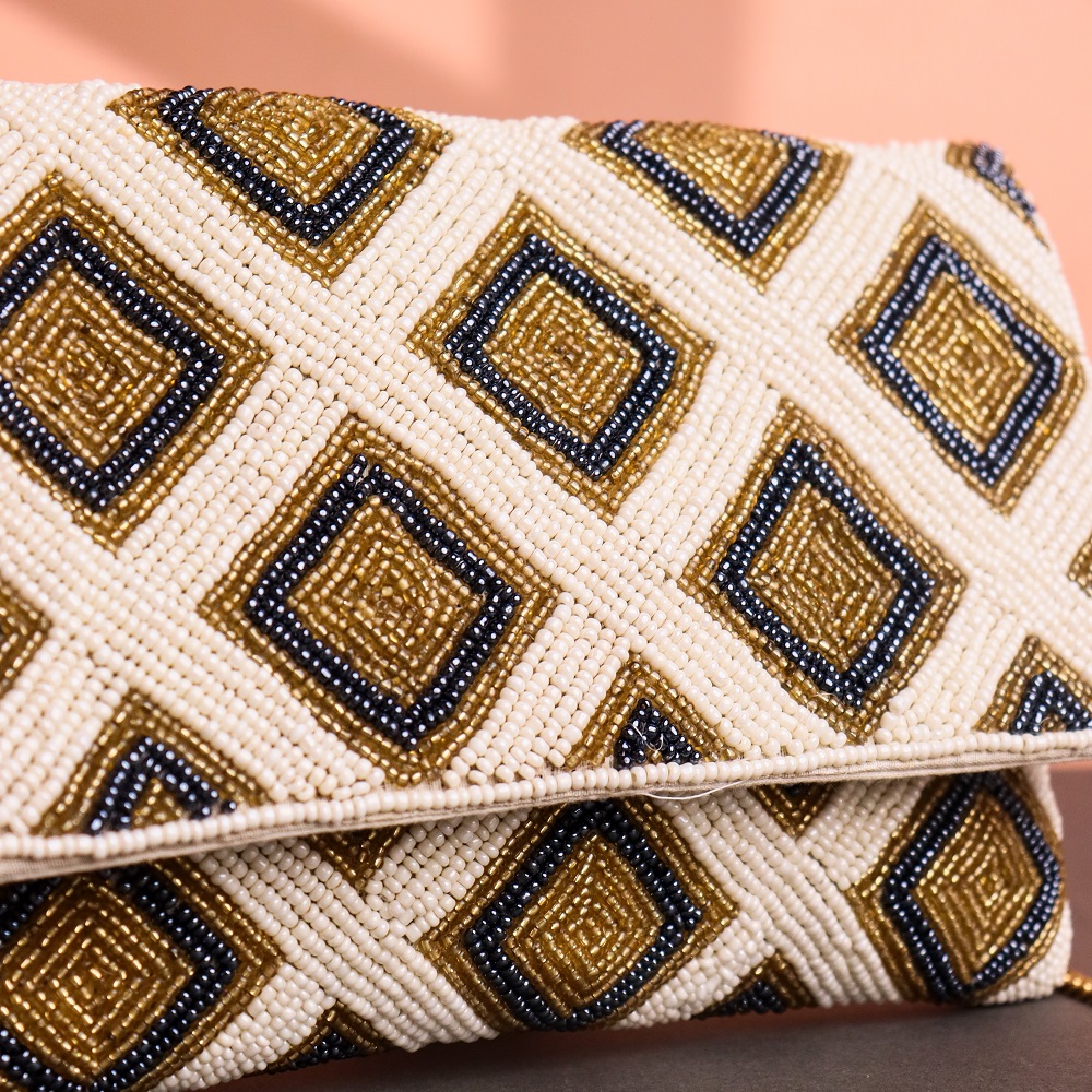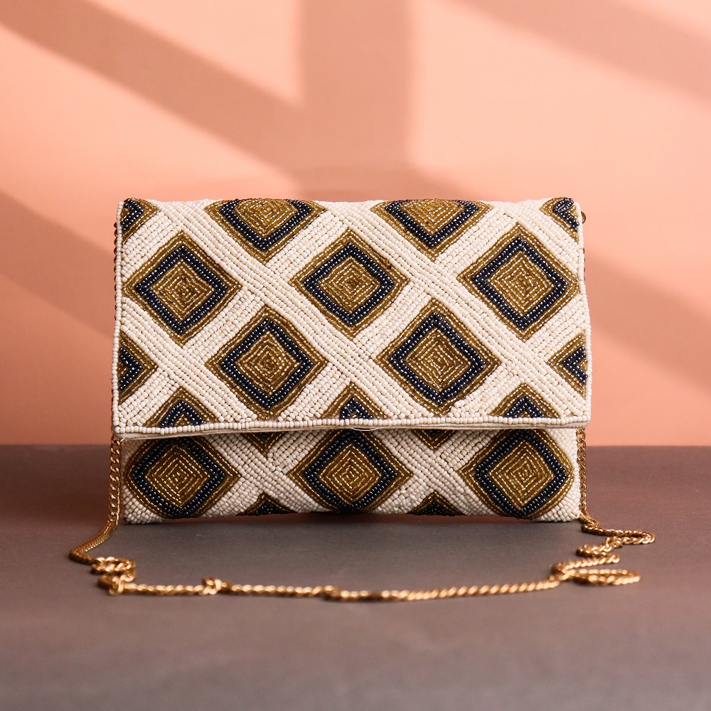 Hand-embroidered Beadwork: Crafted with precision using premium-quality beads in gold, ivory, and black. Striking Geometric Design: Bold diamond pattern for a modern, luxurious aesthetic. Magnetic Flap Closure: Ensures secure and easy access to your essentials. Detachable Gold Chain Strap: Offers the flexibility to wear as a clutch or sling.