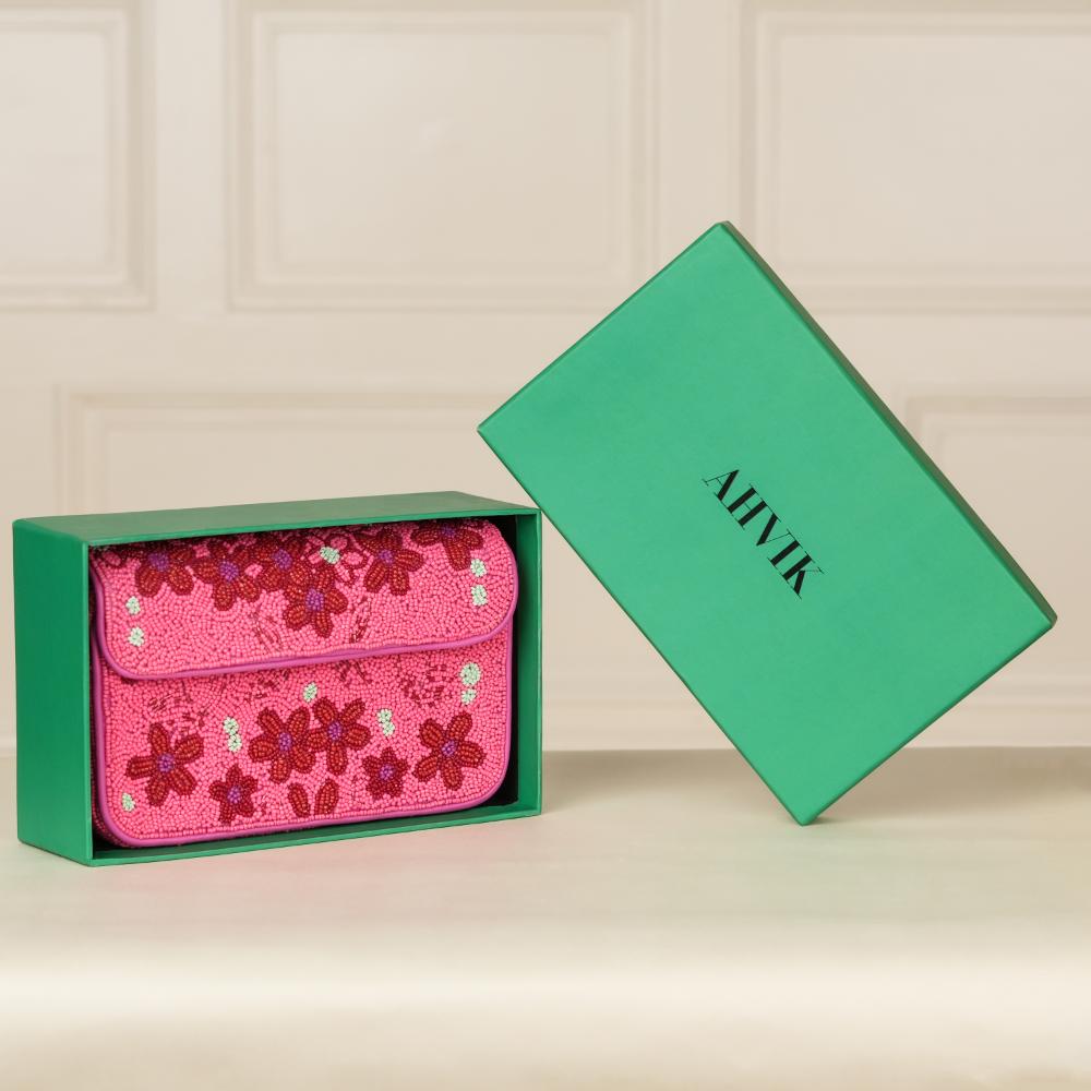 Add a bold statement piece to your wardrobe with this luxury handmade beaded shoulder bag in striking hot pink, beautifully decorated with intricate red floral beadwork and accents of mint green highlights. Designed for women who love a vibrant touch, this bag combines artisan craftsmanship with a chic, modern style. Perfect for parties, festive events, or a standout everyday accessory.