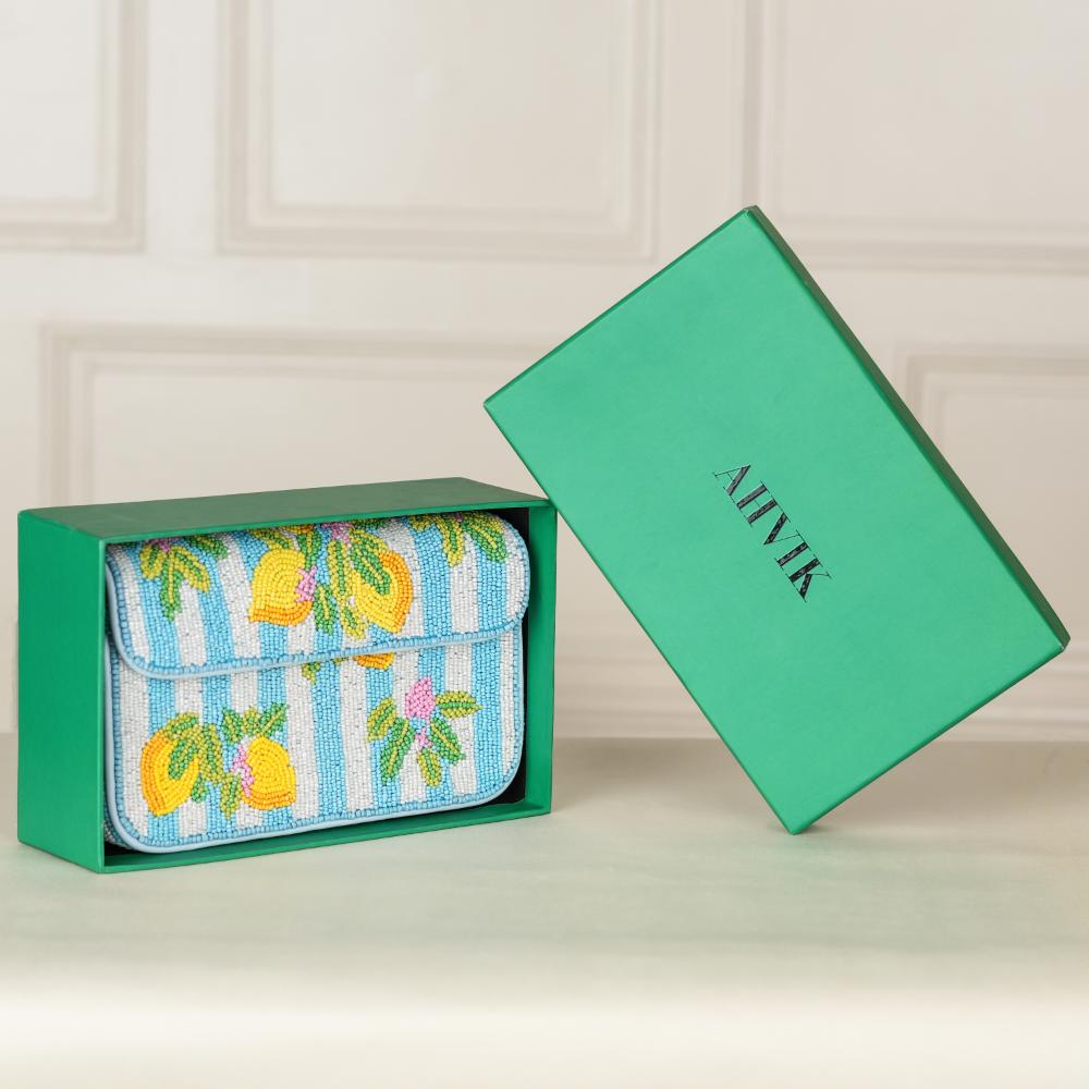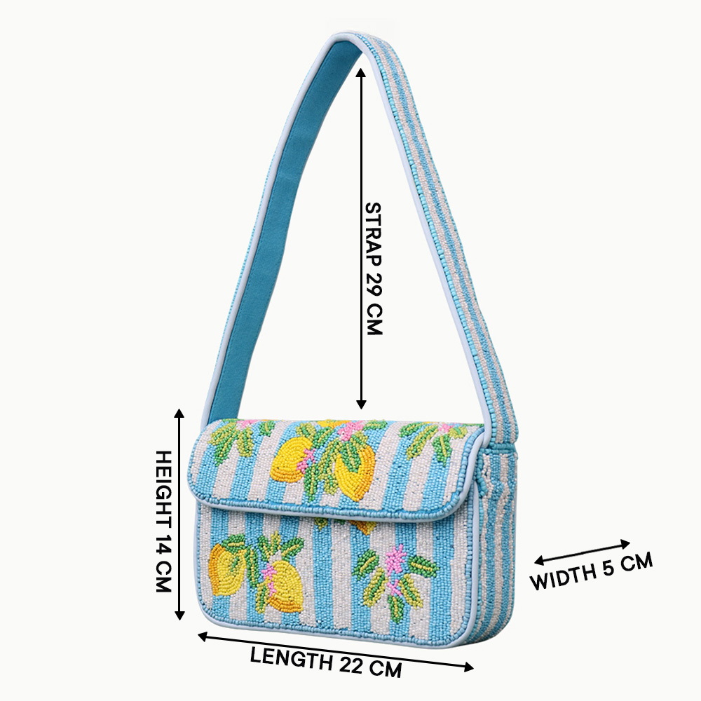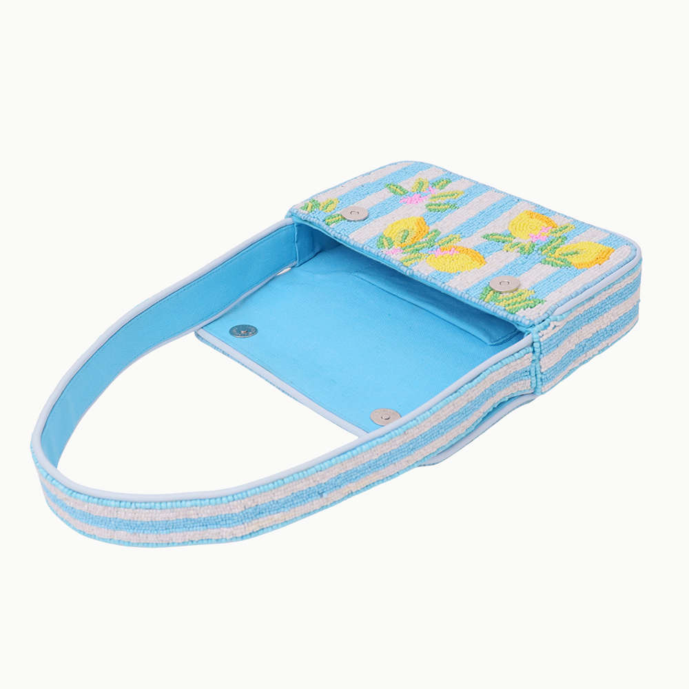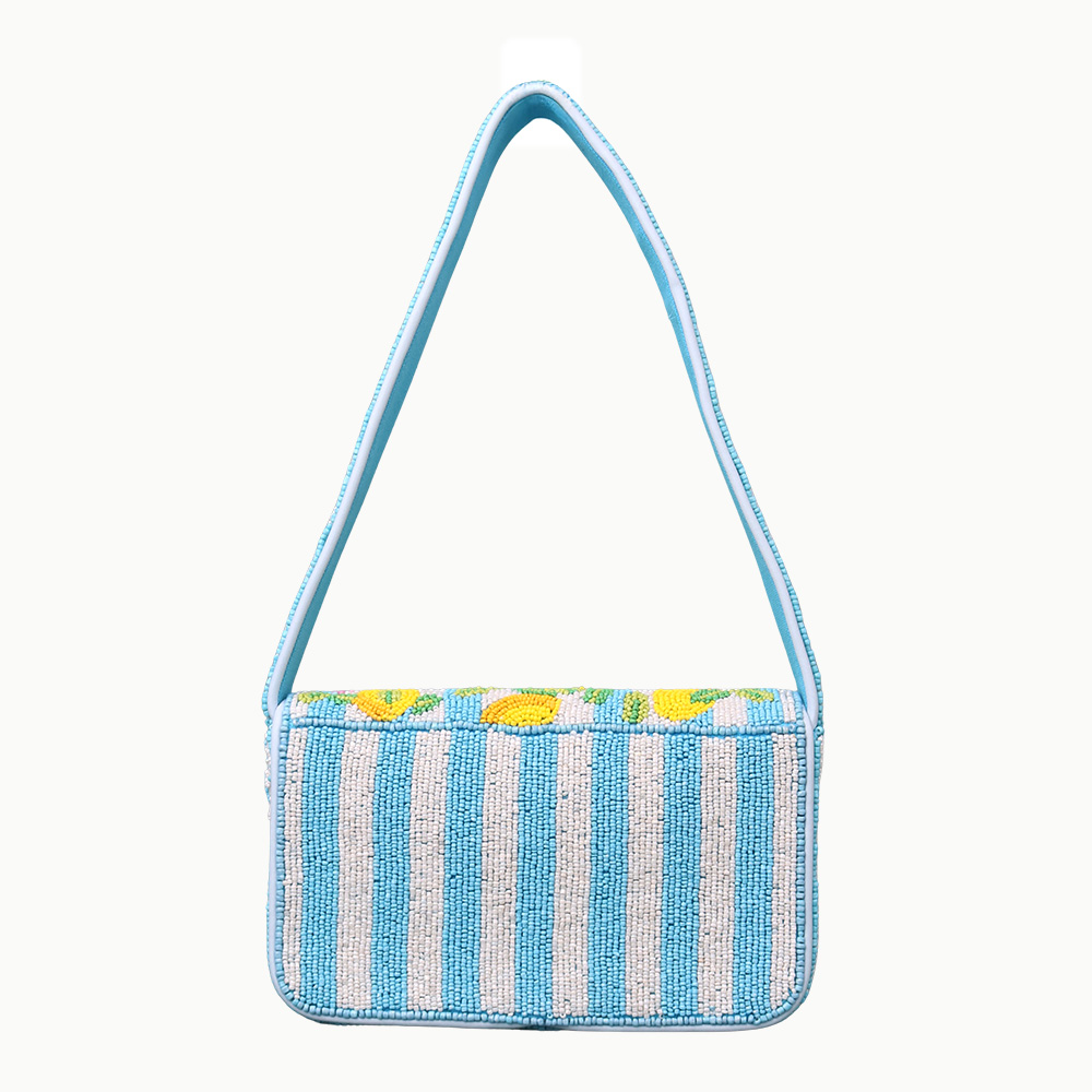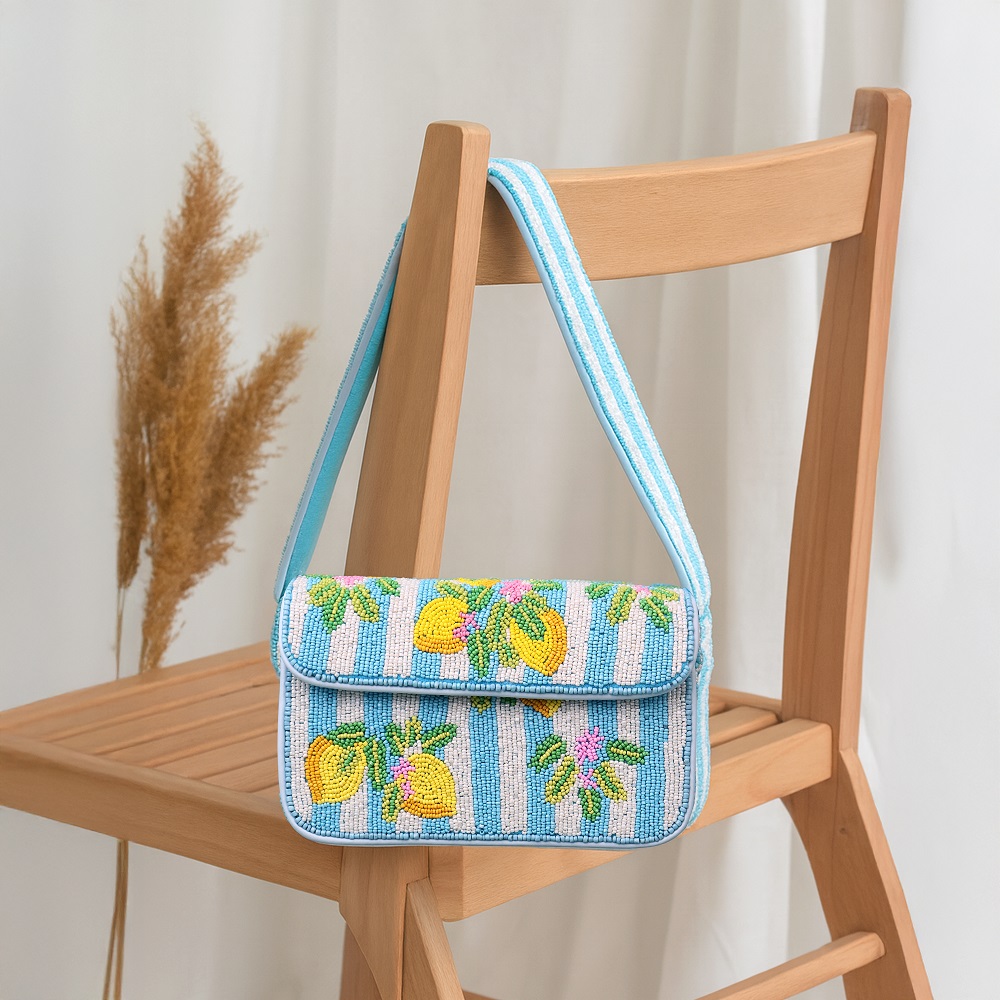 Brighten your style with this luxury handmade beaded shoulder bag, featuring a refreshing lemon fruit pattern on sky-blue stripes. Carefully crafted with high-quality glass seed beads, this artisan bag blends playful charm with elegant detailing. The vibrant yellow lemons, green leaves, and pink floral accents pop against the striped background, making it a perfect luxury accessory for summer outings, parties, or vacation looks. With a sturdy beaded strap and secure flap closure, it is both fashionable and functional.