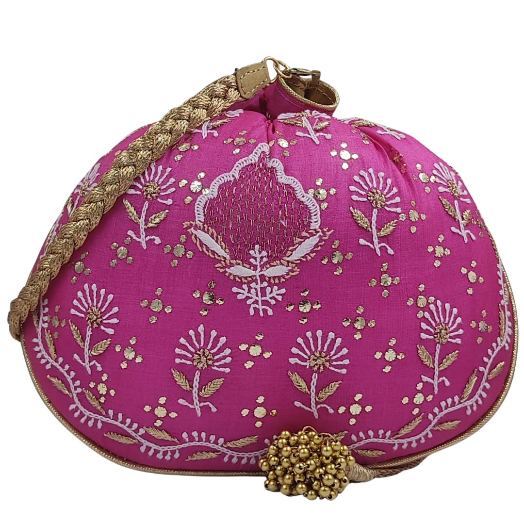 Make a vibrant statement with this beautifully handcrafted potli bag, fashioned from premium tussar silk in a bold and festive rani pink shade. Showcasing traditional Chikankari embroidery on both sides, the design is further accentuated with shimmering mukaish work, creating a sparkling effect that perfectly complements the vivid base. Intricate white and gold floral motifs, along with a signature central emblem, add richness and texture to the piece. The potli features a golden braided handle and a traditional drawstring closure adorned with elegant golden pearl tassels on both ends. Compact yet spacious, it's ideal for carrying your essentials in style. Whether paired with sarees, lehengas, or fusion wear, this potli bag adds a stunning pop of color and elegance to any festive or celebratory look. A perfect accessory for weddings, festive events, or gifting, it captures the perfect blend of heritage artistry and contemporary flair.