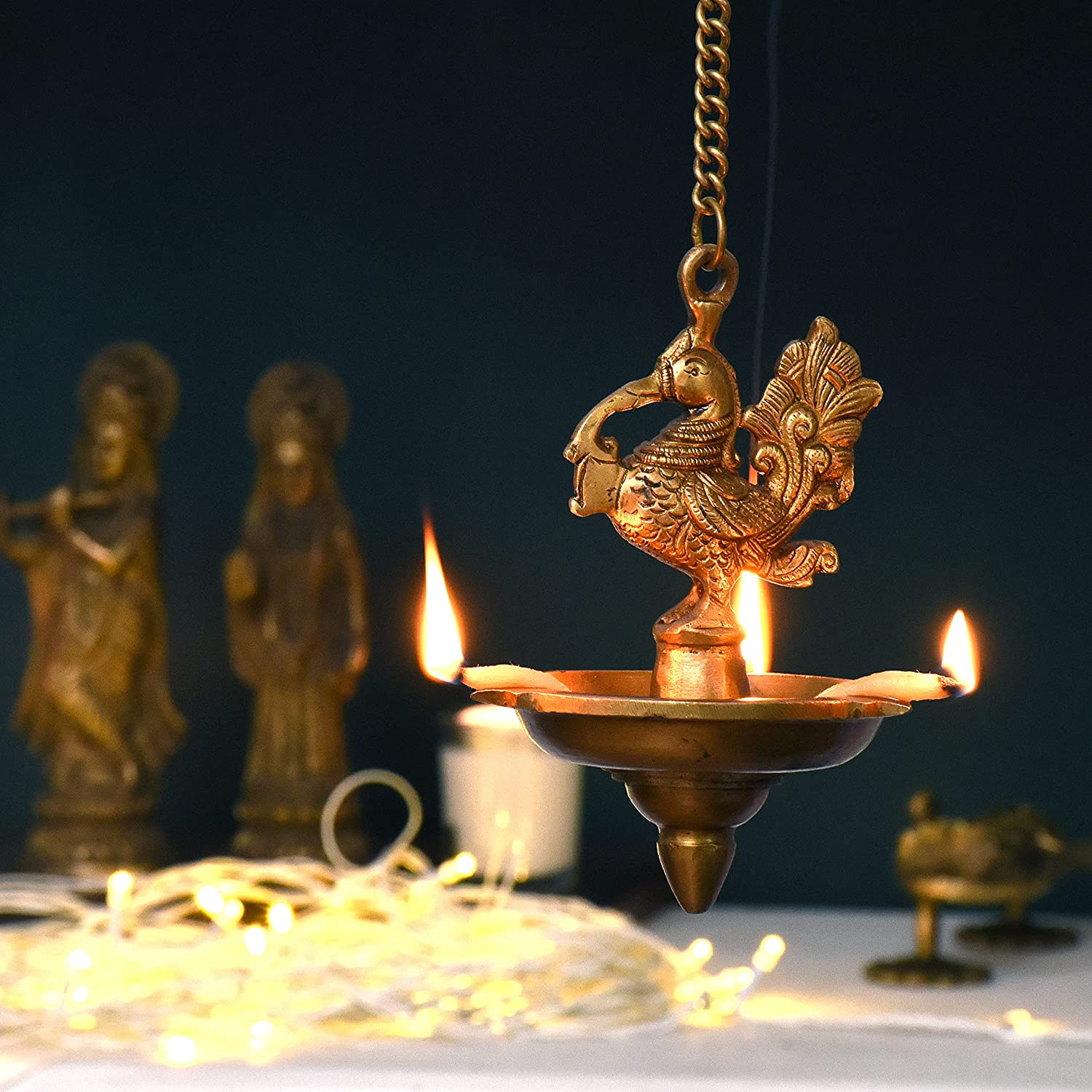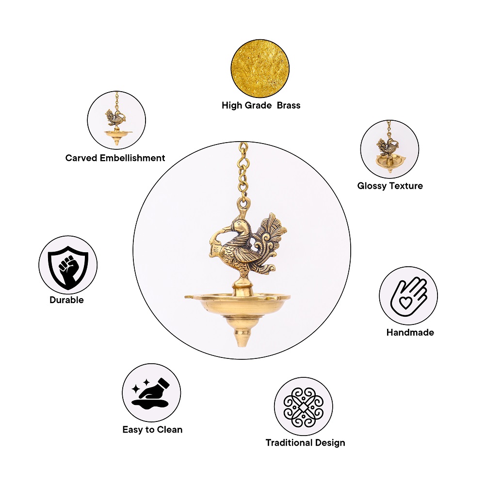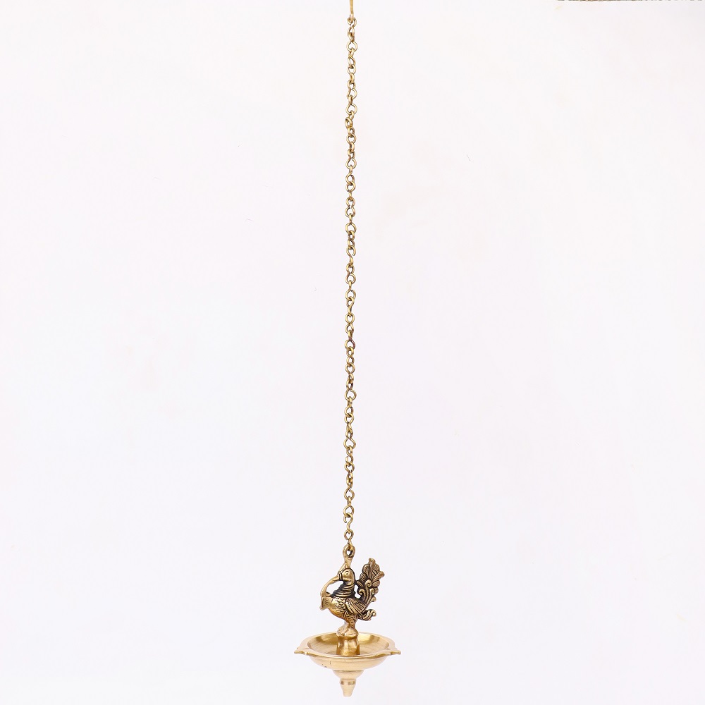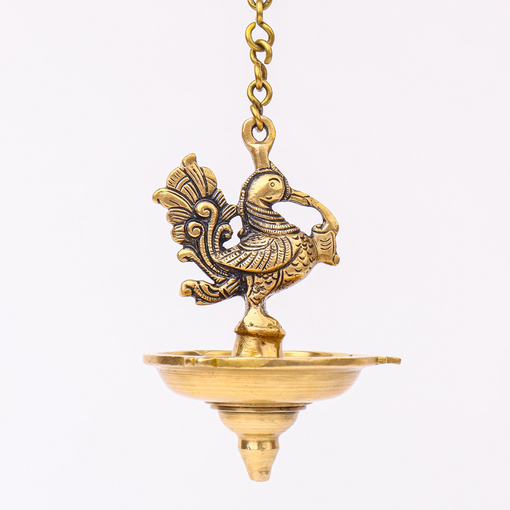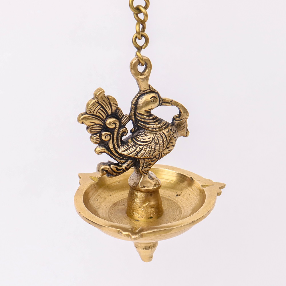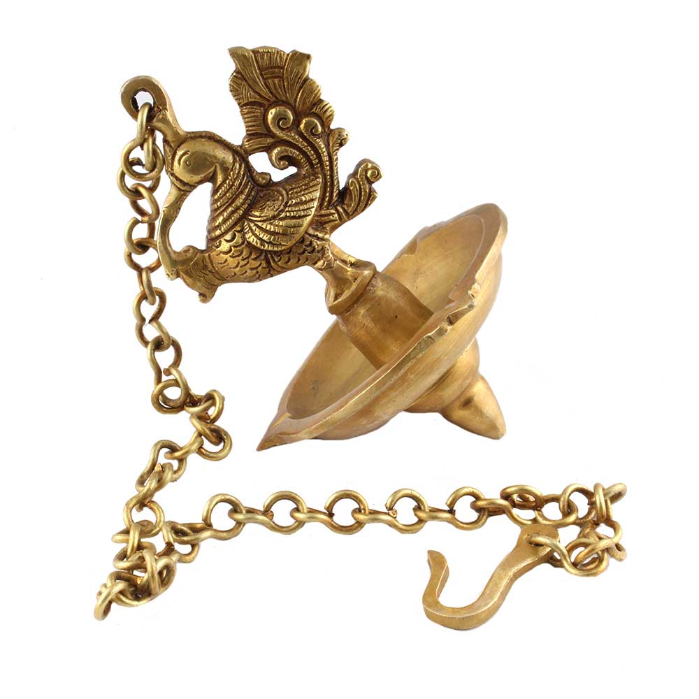 Decorate Your Homes, Offices, Temples with this magnificent brass peacock with hanging lamp Or diya with a lovely chain with a hook. Part of any religious or cultural gathering. Gift for your near and dear ones.