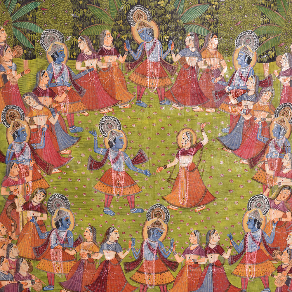Maha Raas is a word used in Hindu mythology to describe Lord Krishna's holy dance with the cowherd females of Vrindavan. This cosmic dance is regarded as one of the most critical episodes in Lord Krishna's life, and it has been represented in numerous art genres, including Pichwai paintings. The Maha Raas Pichwai artwork is a stunning depiction of this exquisite dance and a monument to India's rich cultural legacy. Lord Krishna is seen in his trademark blue skin, surrounded by gopis in various attitudes, dancing and chanting in pleasure. The painting's composition is centred on Lord Krishna, who is seen playing his flute and surrounded by gopis. The gopis are seen in bright saris dancing around Lord Krishna, engrossed at the moment. The artwork's backdrop is loaded with detailed features, such as trees, flowers, and animals, which give the image depth and substance. The painting's bold and brilliant colours, red, yellow, and green, dominate the composition. The artwork reflects the joyous mood of the Maha Raas, with Lord Krishna and the gopis lost in divine pleasure throughout the dance. The Maha Raas Pichwai painting or artwork is a monument to the painters' ability and ingenuity and a celebration of Hindu mythology's profound spiritual origins. It is a work of art that has inspired and delighted people of all ages and backgrounds for centuries. The picture is a magnificent depiction of Lord Krishna's holy dance and a doorway into India's rich cultural past, where art and spirituality have been entwined for generations.