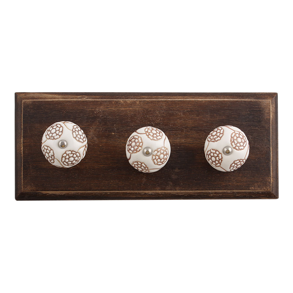Marigold Brown Etched Ceramic Floral Wooden Hook. A Perfect Complement to the Soft Tone of the Wood are these White Traditional Hat & Coat Hook Made of Genuine Porcelain and Brass. It can be use to Hang Jewellery, Leashes, Towels, Scarves, Light Weight Sweaters, Caps Etc.
