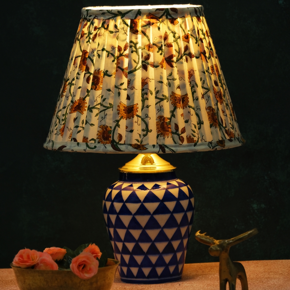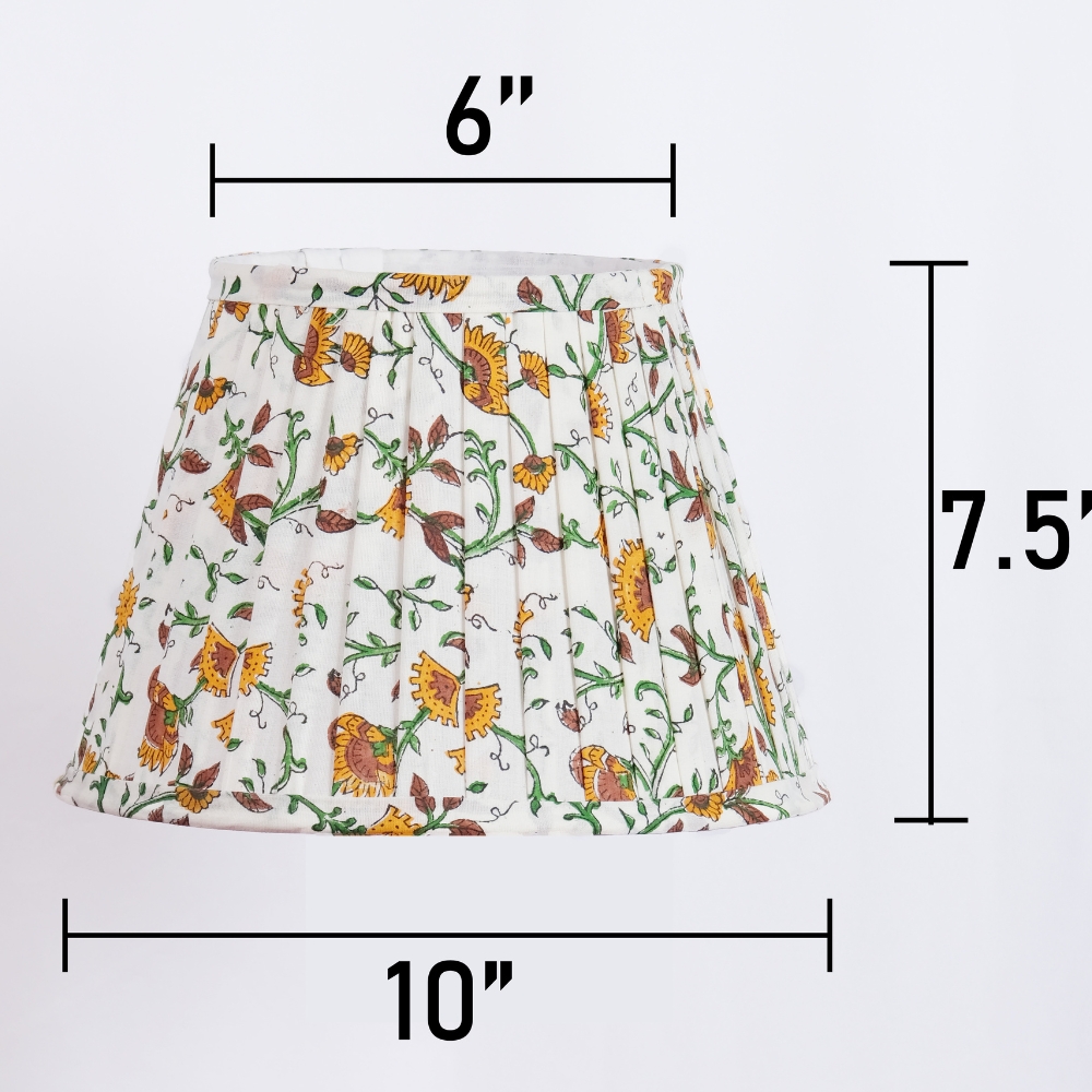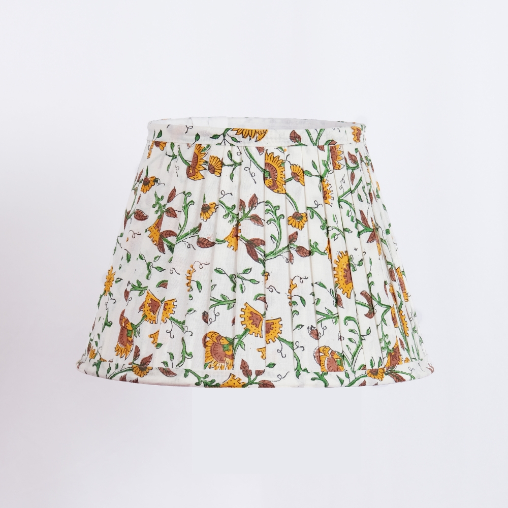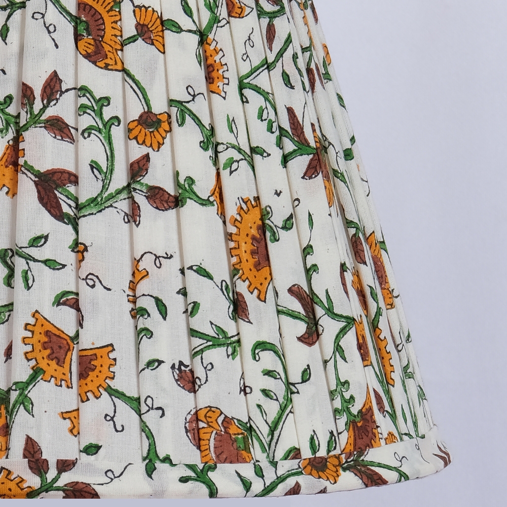 Marigold flower motifs are hand block printed by the artisans of Sanganer city of Rajasthan on soft cotton fabric. A pretty lampshade to highlight any corner of your space.