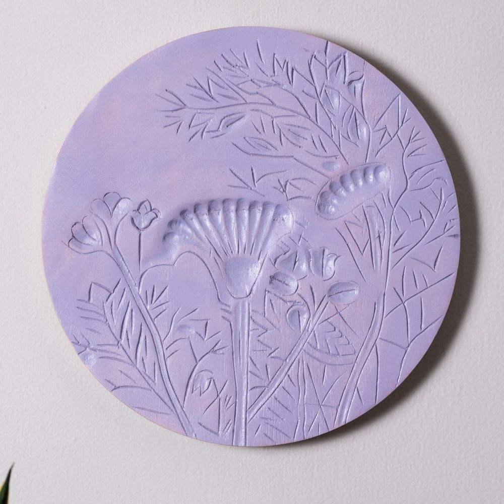 Enhance your home décor with this lavender wooden wall plate, beautifully hand-carved with intricate floral and leafy motifs. Its soft lavender hue adds a calming and sophisticated charm to any space. Packed & quality-checked by Indianshelf.