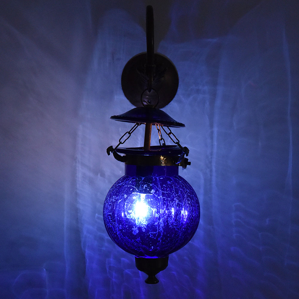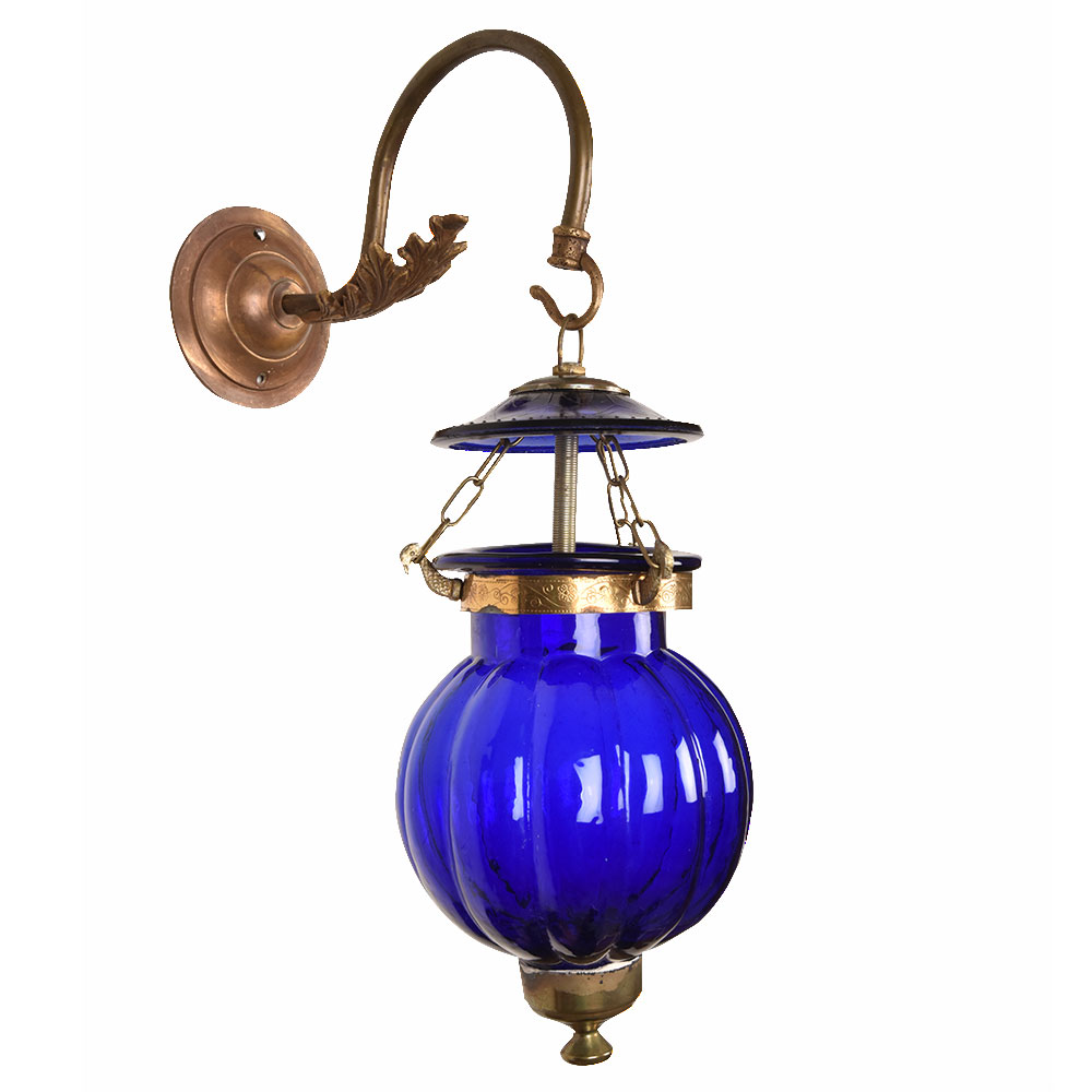Melon shaped Cobalt blue glass hanging lamp in leafy bronze bracket. The lamp is unique and allows a great lighting option for any room.