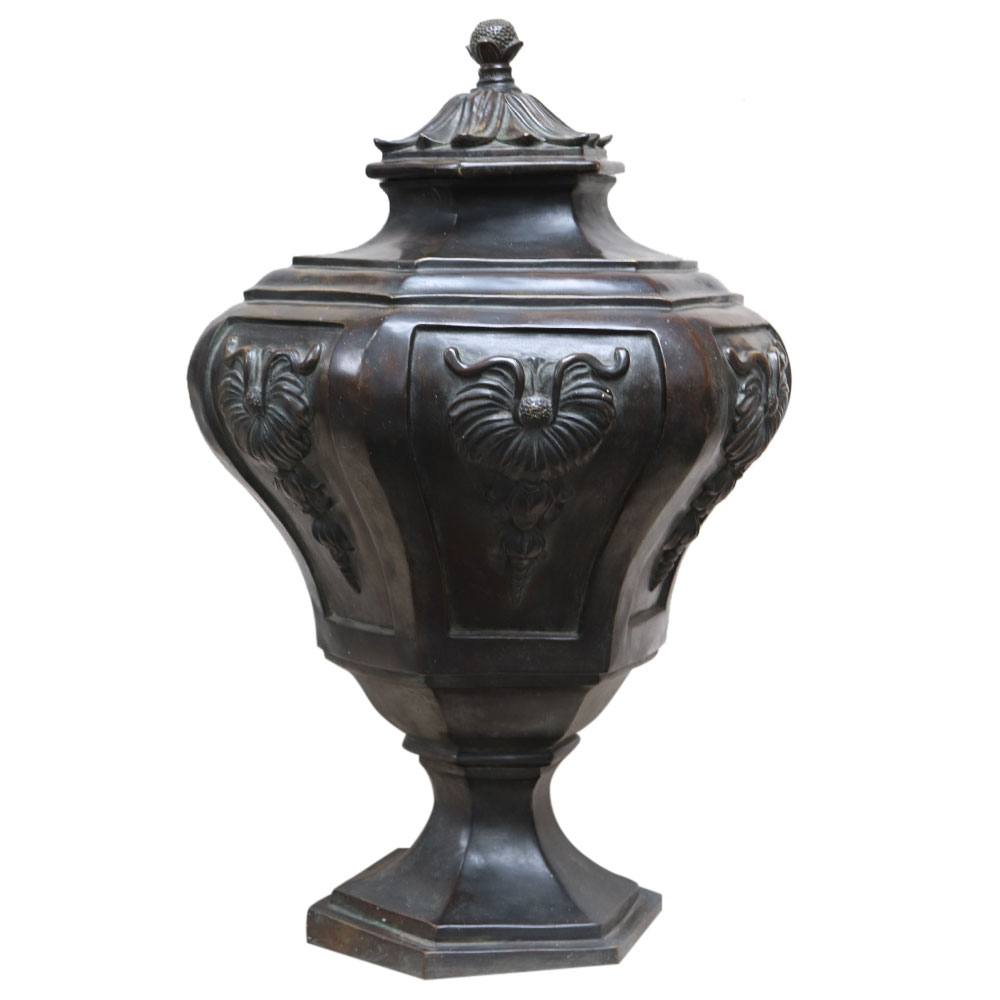 Urn in the shape of a (bell) with a lid and flared, masked handles that show a guy with a moustache. a hexagonal plinth with a decorated pedestal and a lobed central body. Can be utilised as a lovely vintage piece indoors or as a garden urn.