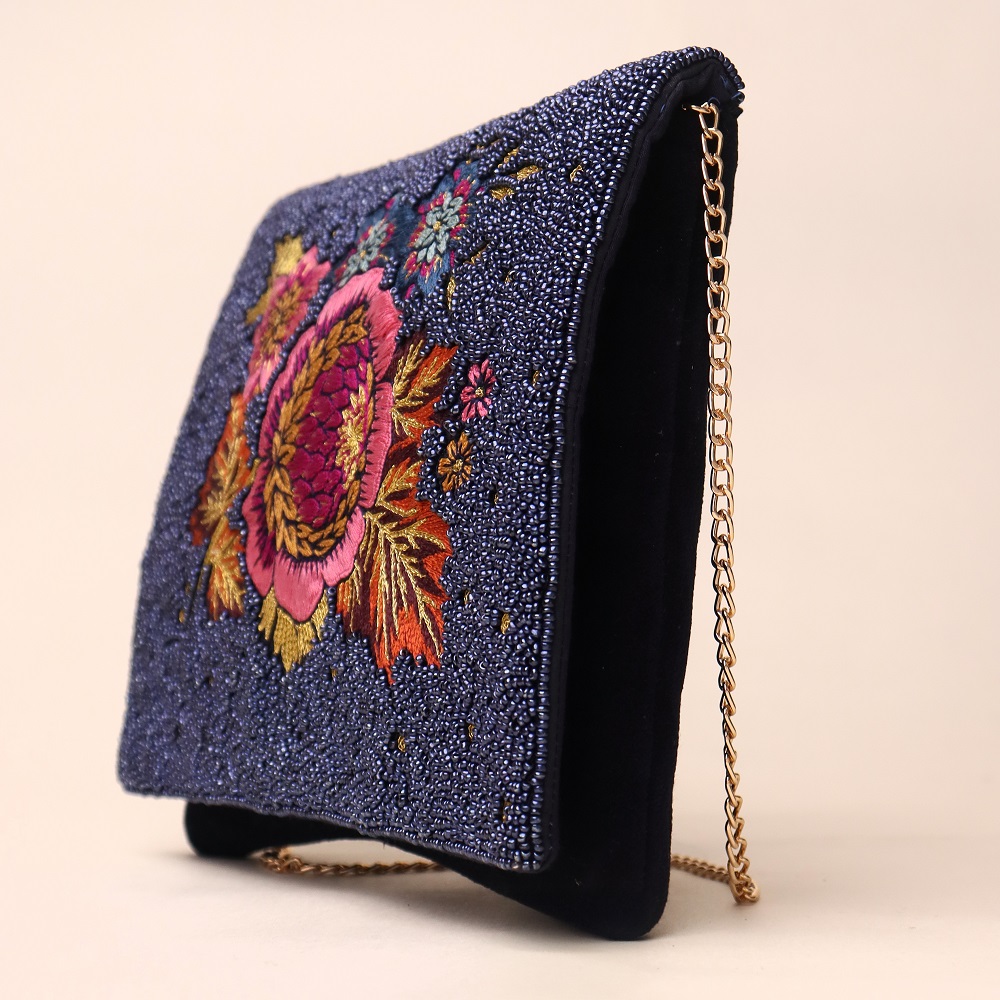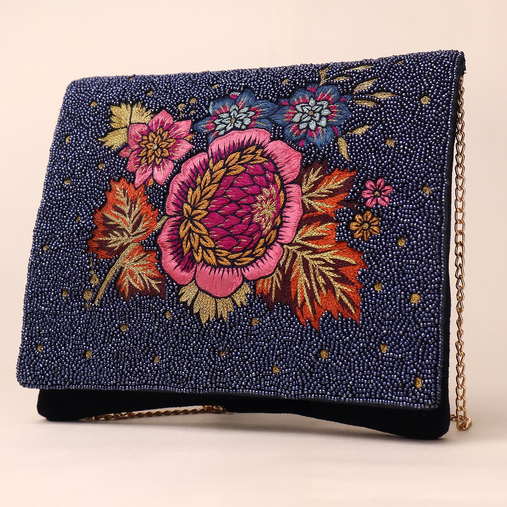 - Design Pattern: Intricately hand-beaded midnight blue base with vibrant floral embroidery