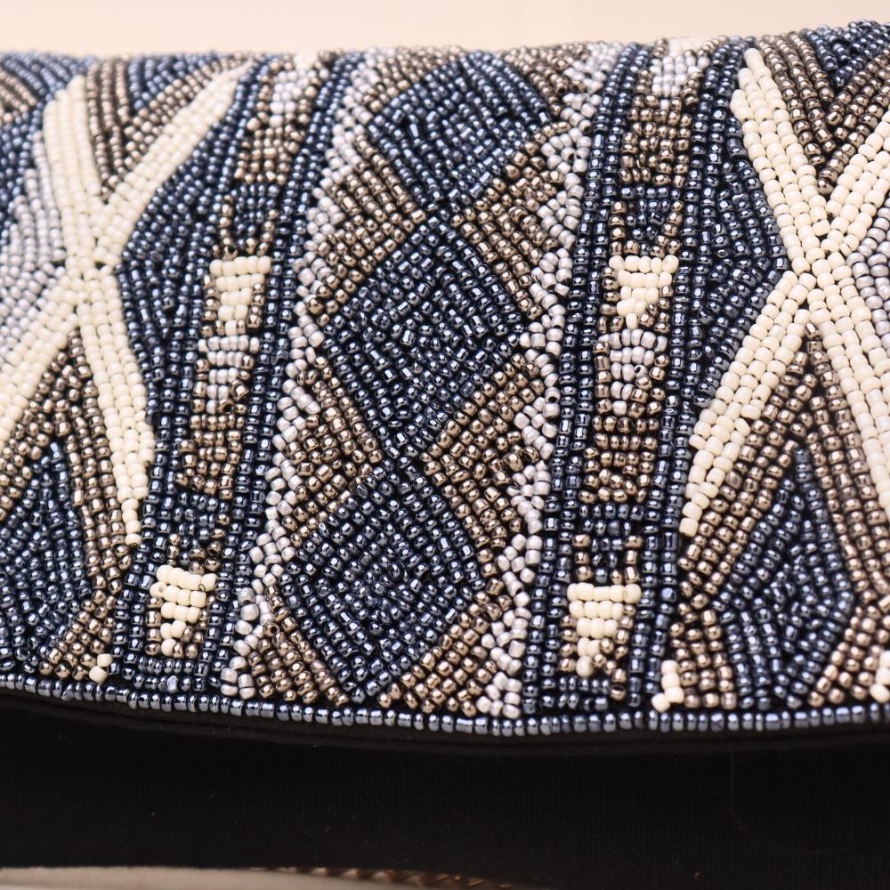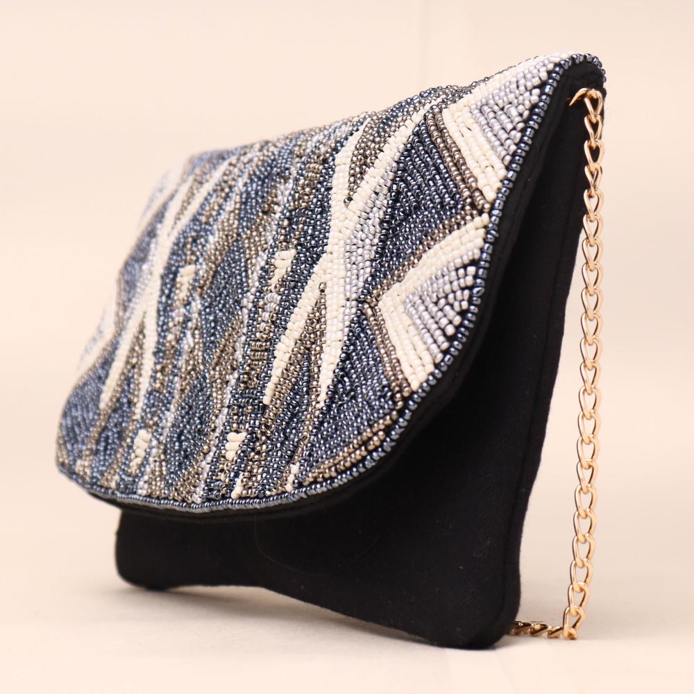 Turn heads with the bold charm of the Midnight Mirage Sling Clutch — a sophisticated statement piece featuring intricate geometric beadwork in a modern tribal-inspired pattern. This versatile accessory functions beautifully as both a handheld clutch and a sling bag, complete with a luxe gold chain strap for added elegance. Whether paired with a sleek evening gown or a fusion ensemble, this bag adds a touch of artisanal glamour to any occasion.