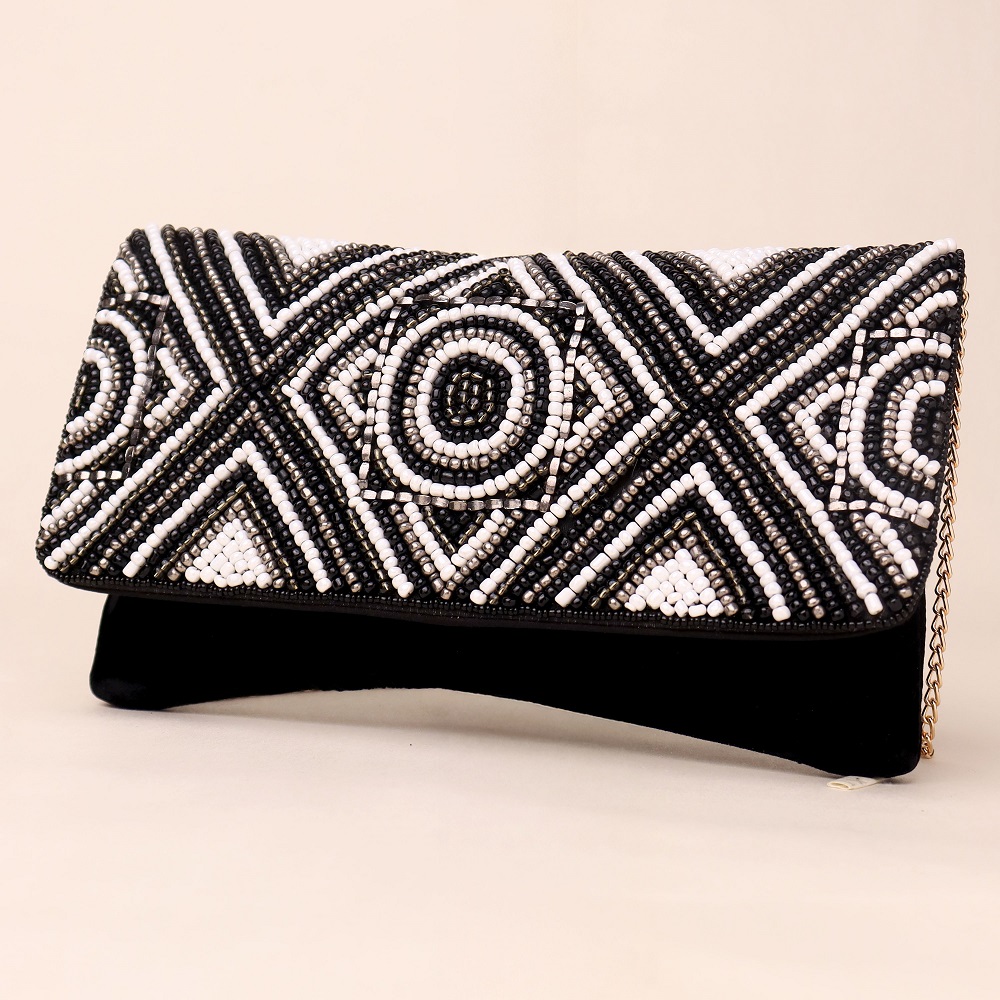 Elevate your style with this stunning handcrafted clutch, where symmetry meets sophistication. Embellished with intricate hand-beaded circular and diamond motifs in a timeless monochrome palette, this piece blends tribal edge with modern elegance. The soft velvet base provides a rich contrast, while the gold-toned chain strap adds functionality and glamour—perfect for wearing crossbody or over the shoulder.