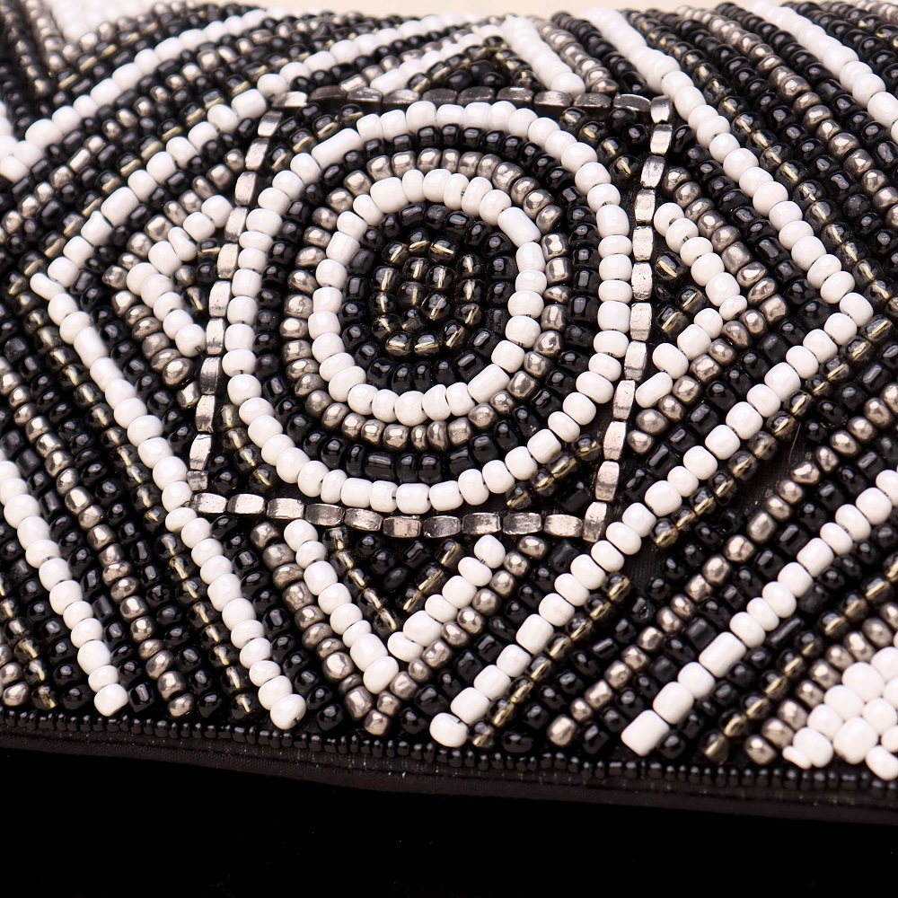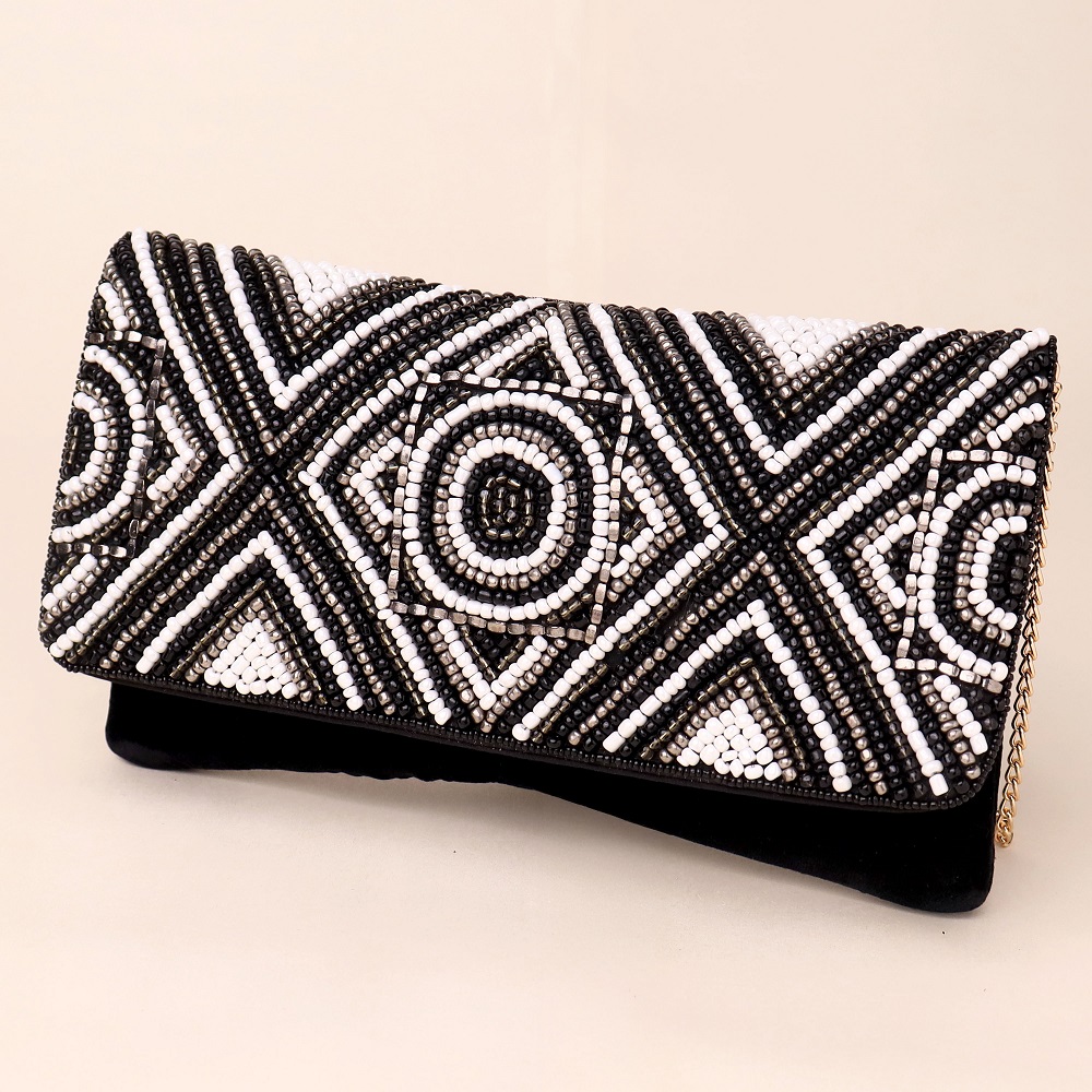 - Design Pattern: Artisan-crafted geometric beadwork on the flap