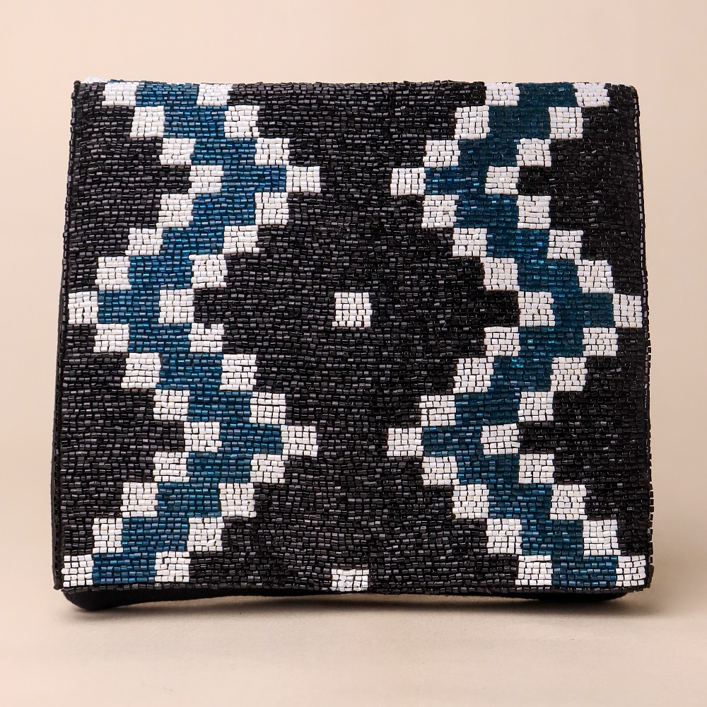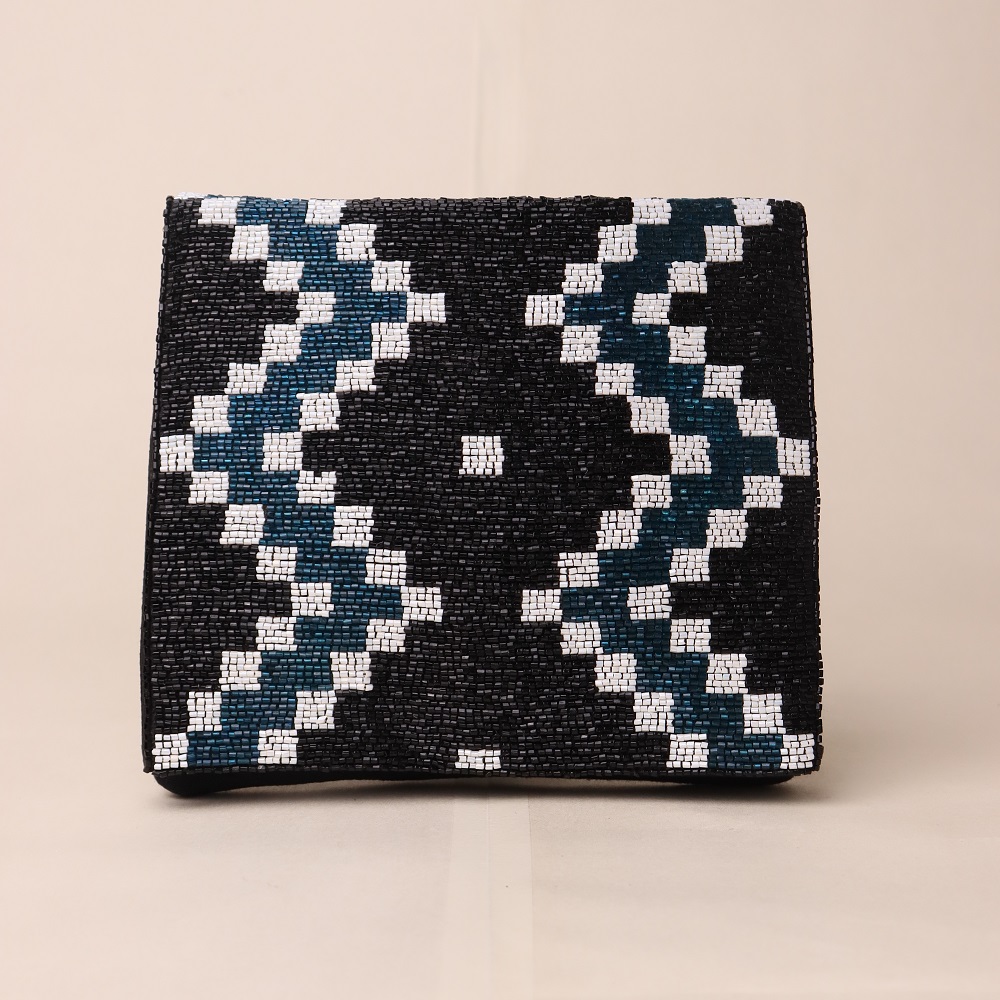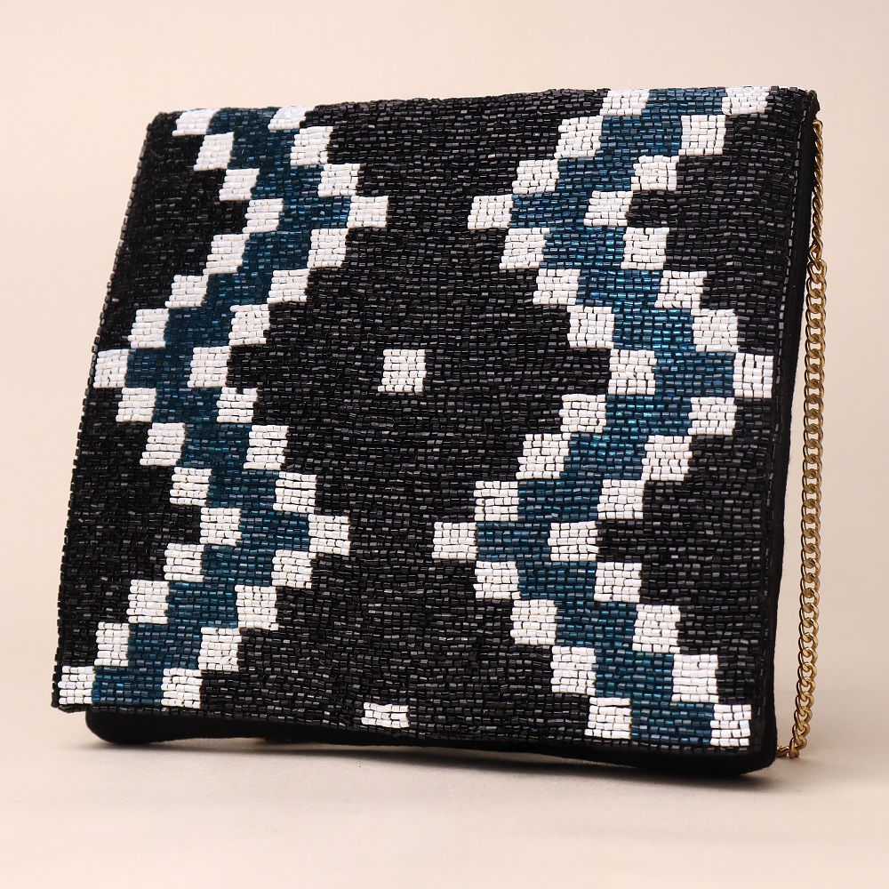 A striking blend of geometric artistry and contemporary style, this hand-beaded sling bag showcases a bold black base with contrasting white and teal mosaic-inspired patterns. Each bead is meticulously hand-applied, creating a textured and eye-catching design perfect for day-to-night transitions. The gold-tone chain strap adds a touch of elegance and versatility, allowing it to be worn as a crossbody, shoulder bag, or carried as a clutch for an elevated evening look.