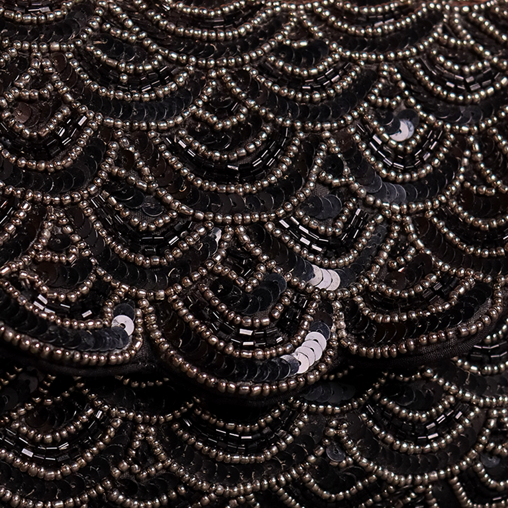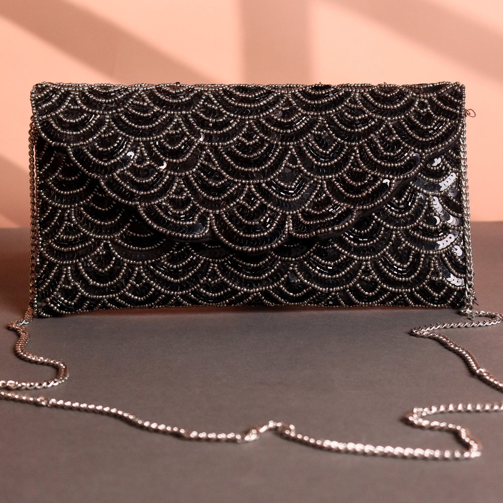Add a touch of starlit glamour to your ensemble with this Midnight Sparkle Black Beaded Clutch. Featuring an elegant scallop wave design crafted with silver beads and shimmering sequins on a rich black base, this clutch radiates sophistication and celebration. The silver chain strap adds to its luxe appeal, making it perfect for receptions, night parties, or upscale soirées.This chic accessory is your go-to for black-tie events, wedding functions, and festive evenings where subtle shine and classic contrast make all the difference.