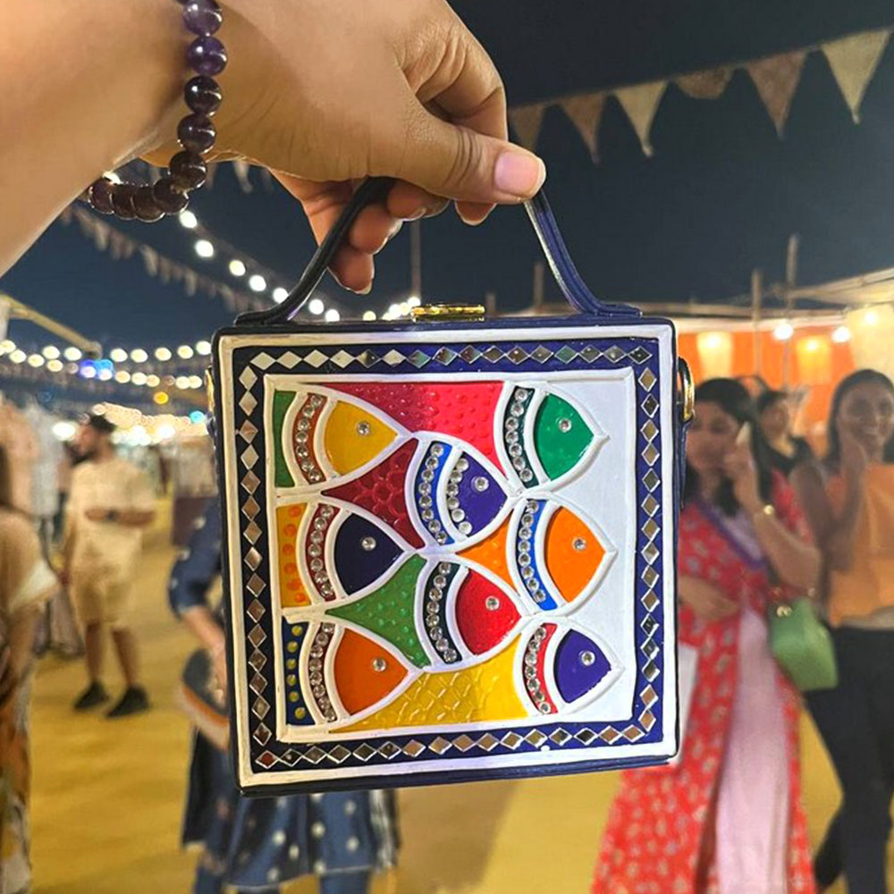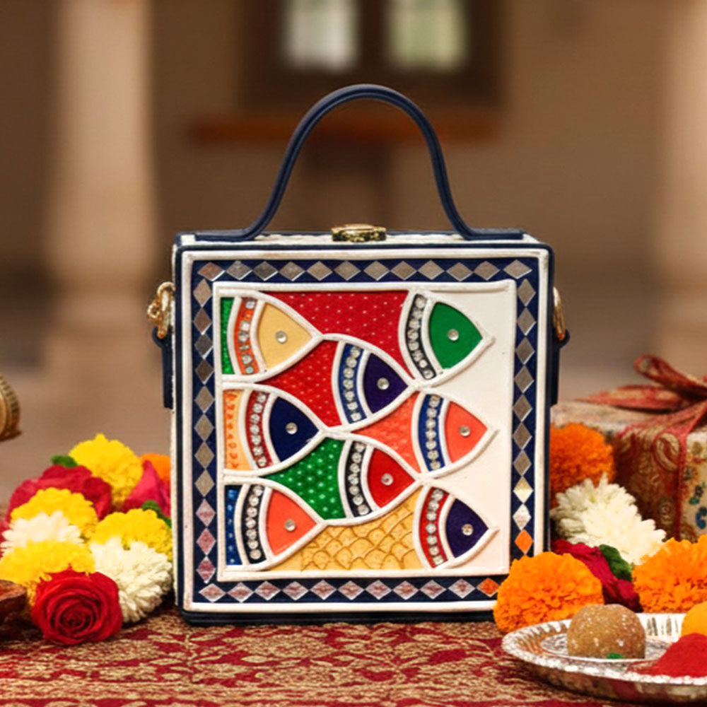 This mini sling box bag showcases fish inspired Lippan art that blends tradition with modern style. Its compact box form and mirrored details make it appealing to collectors decorators and gifters alike. Each piece is handcrafted by skilled artisans and packed and quality checked by Indianshelf.Fish Motif FocusThis charming piece features fish motifs in fine Lippan art appealing to those who love unique cultural accessories and those seeking meaningful gifts.The fish design is sculpted by artisans using Lippan art and reflective pieces.Entirely handmade and never machine madeDurable materials ensure lasting use and versatile styling.Dimensions and Art Details Origin: India. Safely packed and quality checked by Indianshelf Compact form and strap offer comfortable carry.Practical ApplicationsUse as a unique accessory at home or out to showcase the fish motif.Gift this fish themed bag for festivals birthdays or special celebrations.Enhance boutique displays with its artisanal fish design to attract customers.Event planners and collectors can use it as an eye catching cultural accent piece.Maintenance TipsTo care for the fish design avoid exposing the bag to moisture and chemicals. Gently dust it with a soft cloth to keep the Lippan art and mirror work pristine and bright.Common QuestionsHow is the fish motif incorporated?The fish motif is hand sculpted using Lippan art placing mirrors and clay with precision.Can this mini box bag be used frequently?The handcrafted structure makes it reliable for regular use as a unique accessory.What fits inside this piece?It accommodates essentials like keys cards and small cosmetics.Is the sling comfortable for long wear?The sling is comfortable and adjustable for your preferred fit.Celebrating ArtisansEvery piece reflects heritage artistry and careful attention to detail. All our products are handmade never machine made ensuring individuality.
