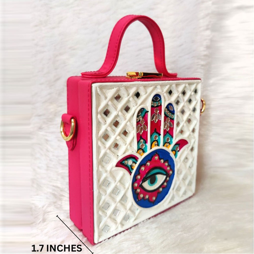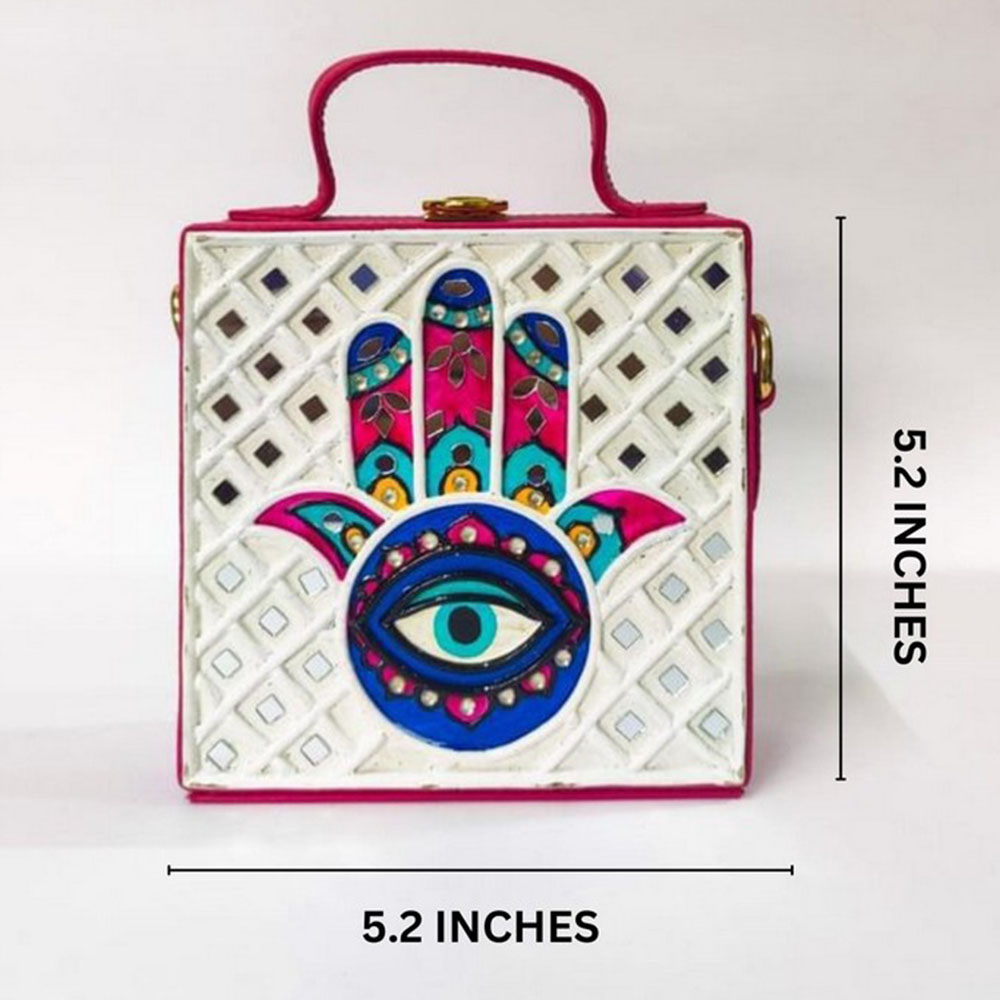 This mini sling box bag showcases hamsa inspired Lippan art that blends tradition with modern style. Its compact box form and mirrored details make it appealing to collectors decorators and gifters alike. Each piece is handcrafted by skilled artisans and packed and quality checked by Indianshelf.Hamsa Emblem ShowcaseThis charming piece features hamsa motifs in fine Lippan art appealing to those who love unique cultural accessories and those seeking meaningful gifts.The hamsa symbol is hand applied with mirrored Lippan clay patterns for a protective charm.Entirely handmade and never machine madeBuilt to endure it balances form and function for versatile wear.Craft and Size Details Origin: India. Safely packed and quality checked by Indianshelf The compact size sits comfortably across the body.Versatile UsesUse as a unique accessory at home or out to showcase the hamsa motif.Gift this hamsa themed bag for festivals birthdays or special celebrations.Enhance boutique displays with its artisanal hamsa design to attract customers.Event planners and collectors can use it as an eye catching cultural accent piece.Preservation AdviceKeep this hamsa themed bag away from water and clean it softly with a dry cloth. Avoid chemicals and rough handling to ensure the hand applied Lippan art stays intact and sparkling for a long time.Frequently Asked QuestionsHow is the hamsa pattern created on this piece?Artisans craft the hamsa pattern with hand applied Lippan art carefully placing each mirror and detail.Is this sling bag durable for regular use?Yes the handcrafted build ensures longevity and resilience for frequent outings.Does this mini bag hold essentials?It comfortably carries essentials like money keys and a small phone.Can the strap be removed or shortened?The strap adjusts easily you can shorten it or remove it as needed.Heritage CraftsmanshipEvery piece reflects heritage artistry and careful attention to detail. All our products are handmade never machine made ensuring individuality.