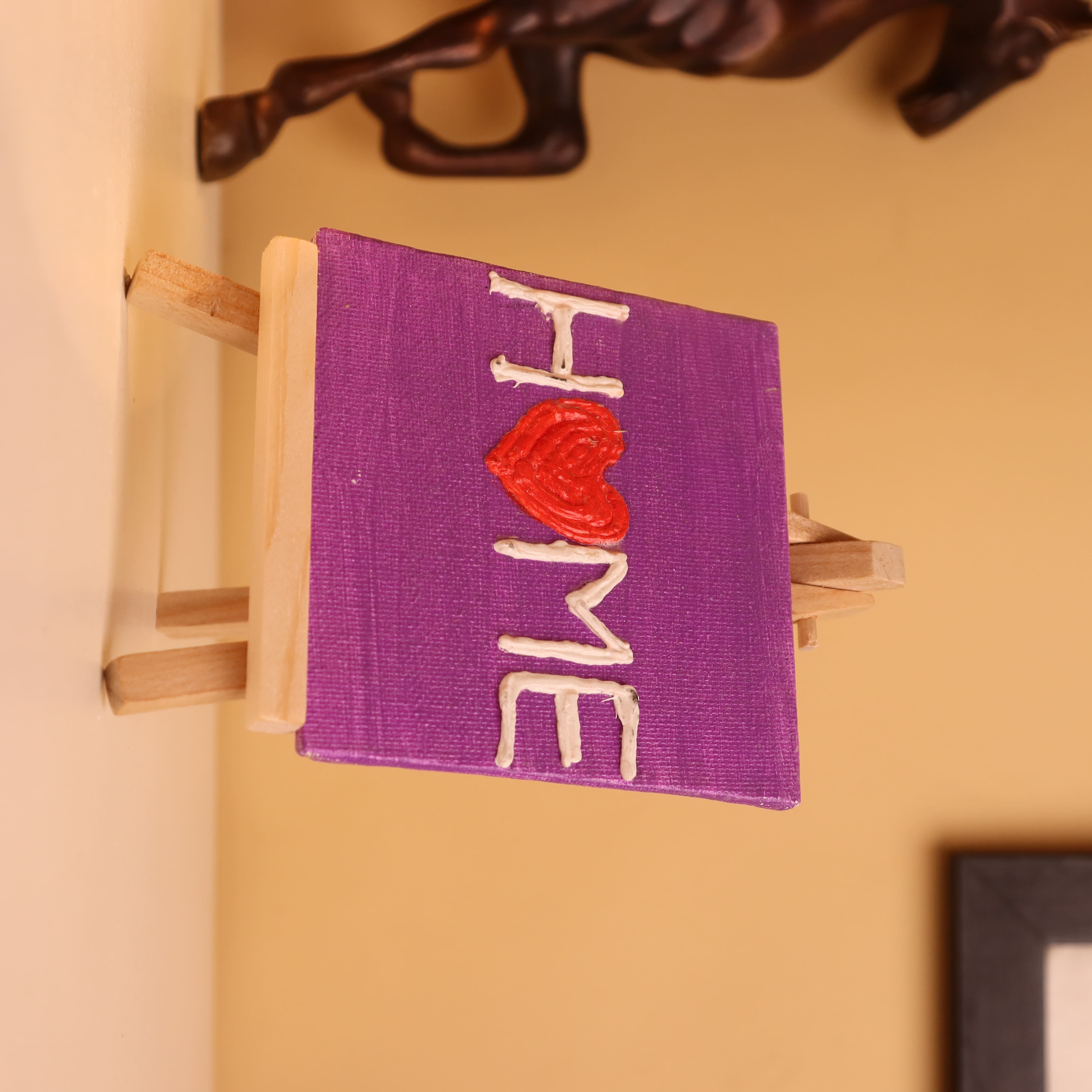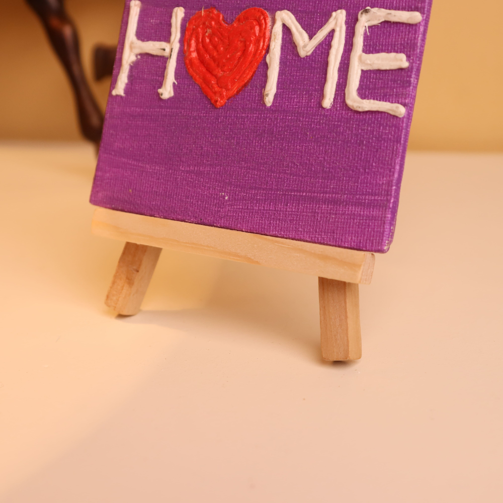 Celebrate the warmth of your space with this charming 4x4 inch handcrafted canvas painting, featuring the word “HOME” with a heartfelt twist. The letter “O” is creatively replaced with a raised red heart, symbolizing love and belonging. Set against a rich purple background, the white textured letters pop with clarity, while the bold heart adds a vibrant emotional touch. Created using textured paint, this mini artwork has a raised, tactile feel that brings the word to life—perfect for desks, side tables, or as a meaningful gift for housewarmings or loved ones far away. The piece comes mounted on a natural wooden easel, making it ready to display without the need for framing. Its compact size makes it a great décor accent for small corners or cozy spaces. Every stroke is handmade with care, making each canvas one-of-a-kind. Add a loving statement to your home with this miniature, heart-filled wall art.