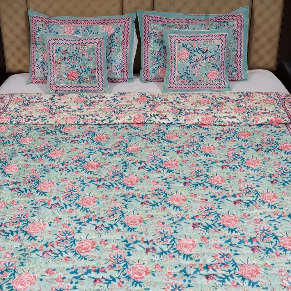 This turquoise and pink Malmal (Voile) quilt celebrates the art of Indian hand-block printing with its intricate floral motifs and balanced pastel palette. Made from ultra-soft cotton voile, it offers breathable warmth and an inviting texture. Lovingly handmade and quality-checked by Indianshelf for lasting beauty and authenticity.
