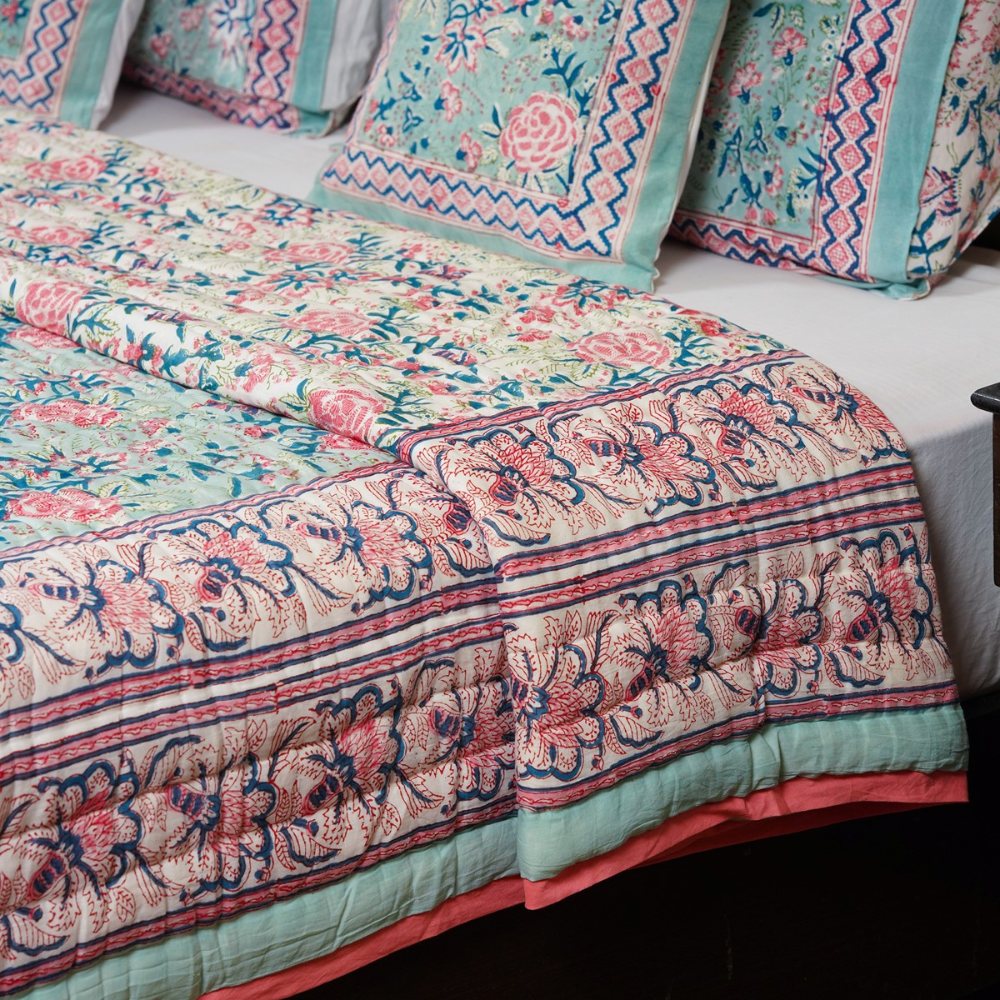 This quilt honors India’s centuries-old hand-block printing legacy. Each piece is handmade — never machine-made — ensuring originality and artisanal excellence.