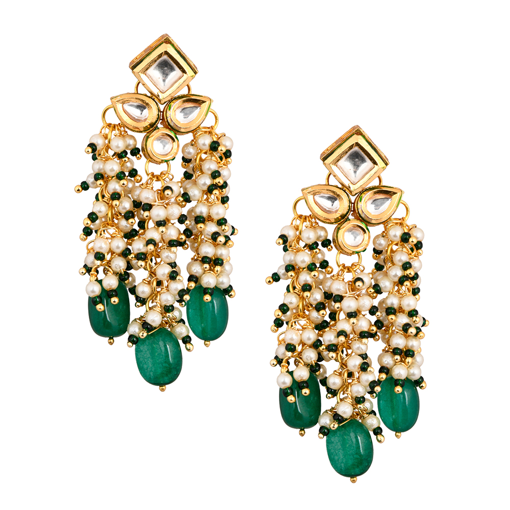 These earrings combine mirror-cluster design with pearl strands and green bead drops, offering a sophisticated yet vibrant accessory for both traditional and contemporary styles.