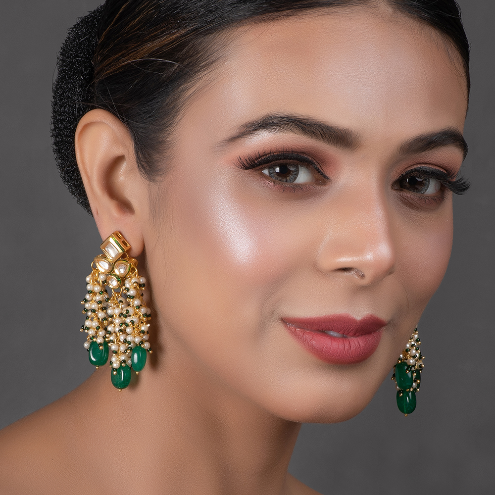 These earrings combine mirror-cluster motifs with elegant pearl and green bead tassels, handcrafted to offer a distinctive balance of classic and vibrant elements.
