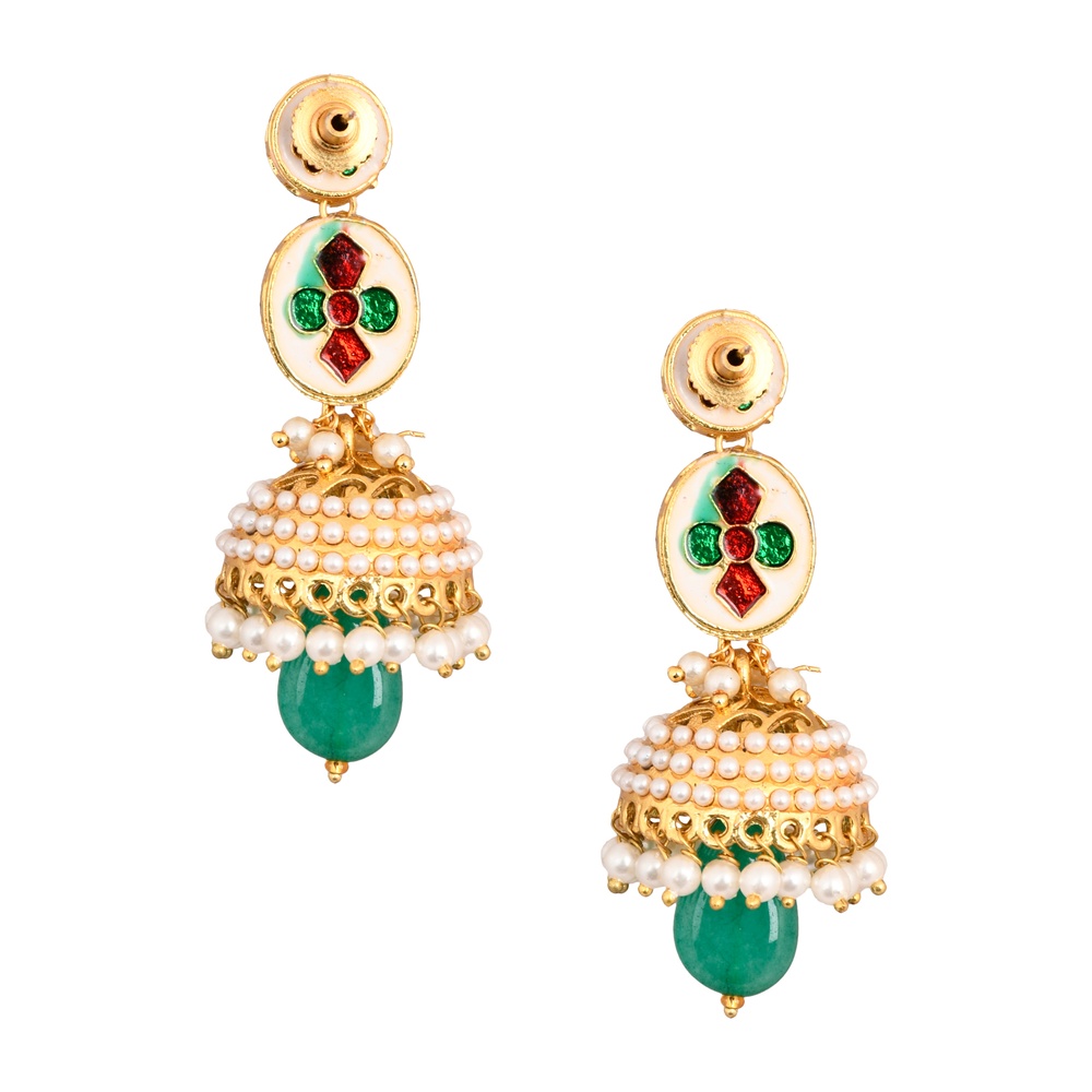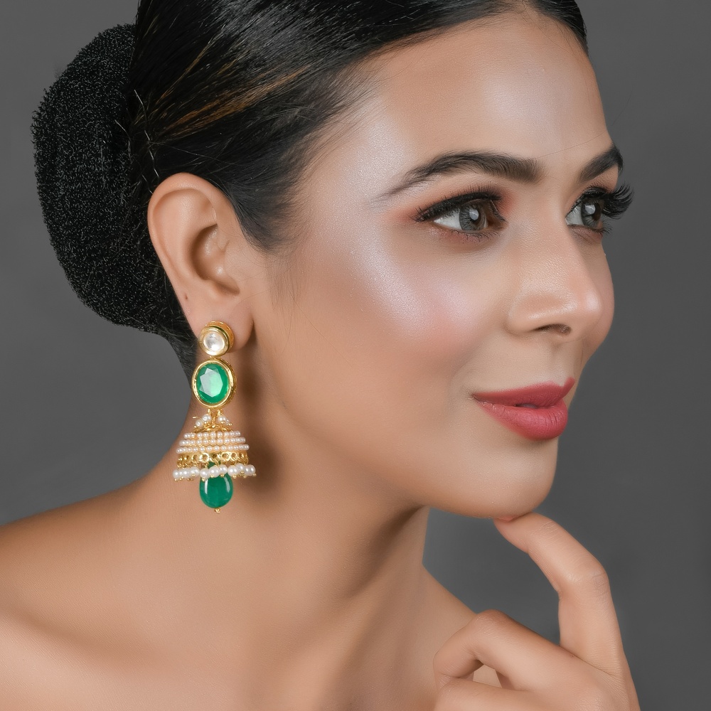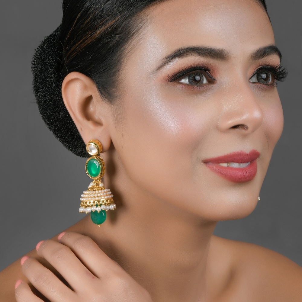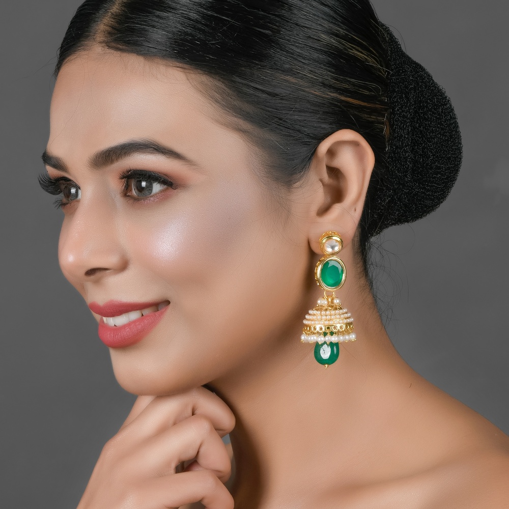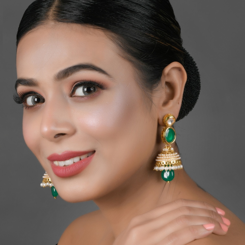 This pair combines mirror stones, green crystals and a pearl dome in a handcrafted jhumka design, offering a balance of classic and contemporary elements.