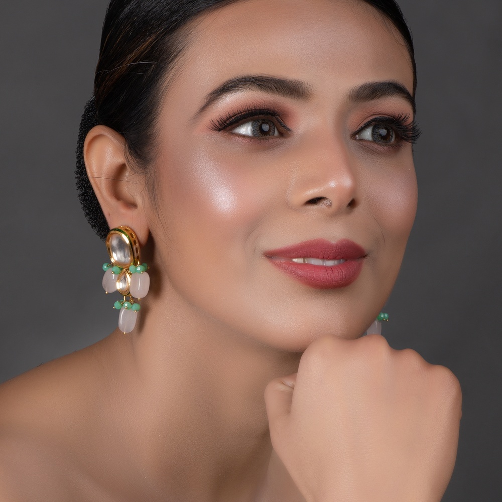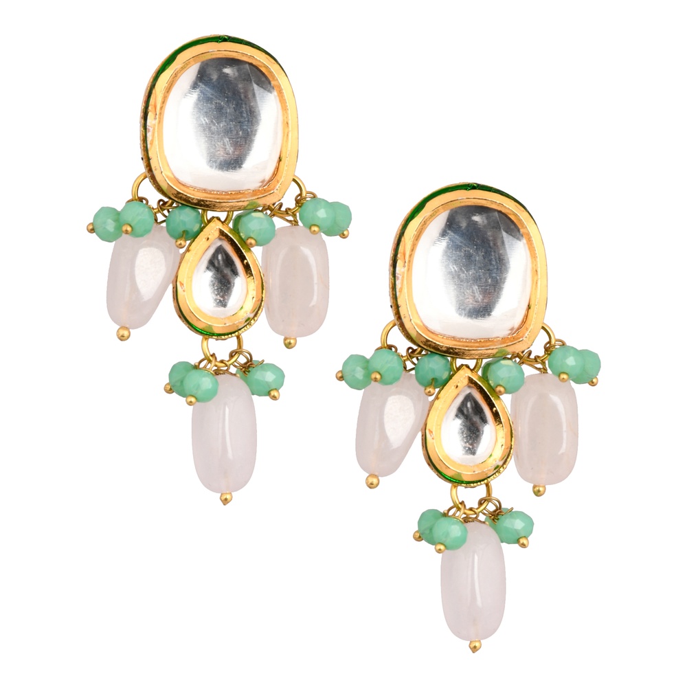 Celebrate refined elegance with our handcrafted Mirror Oval & Teardrop Earrings with Green & White Beads. These eye-catching earrings feature a striking large oval mirror stone at the top, complemented by a teardrop mirror stone at the center. Soft green bead clusters and elongated white drops cascade beneath, adding a touch of colour and fluid movement. Perfect for weddings, festivals and thoughtful gifting, they blend minimal design with vibrant detail.