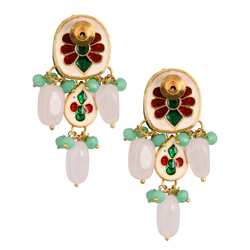 Mirror Oval & Teardrop Earrings with Green & White Beads Pair