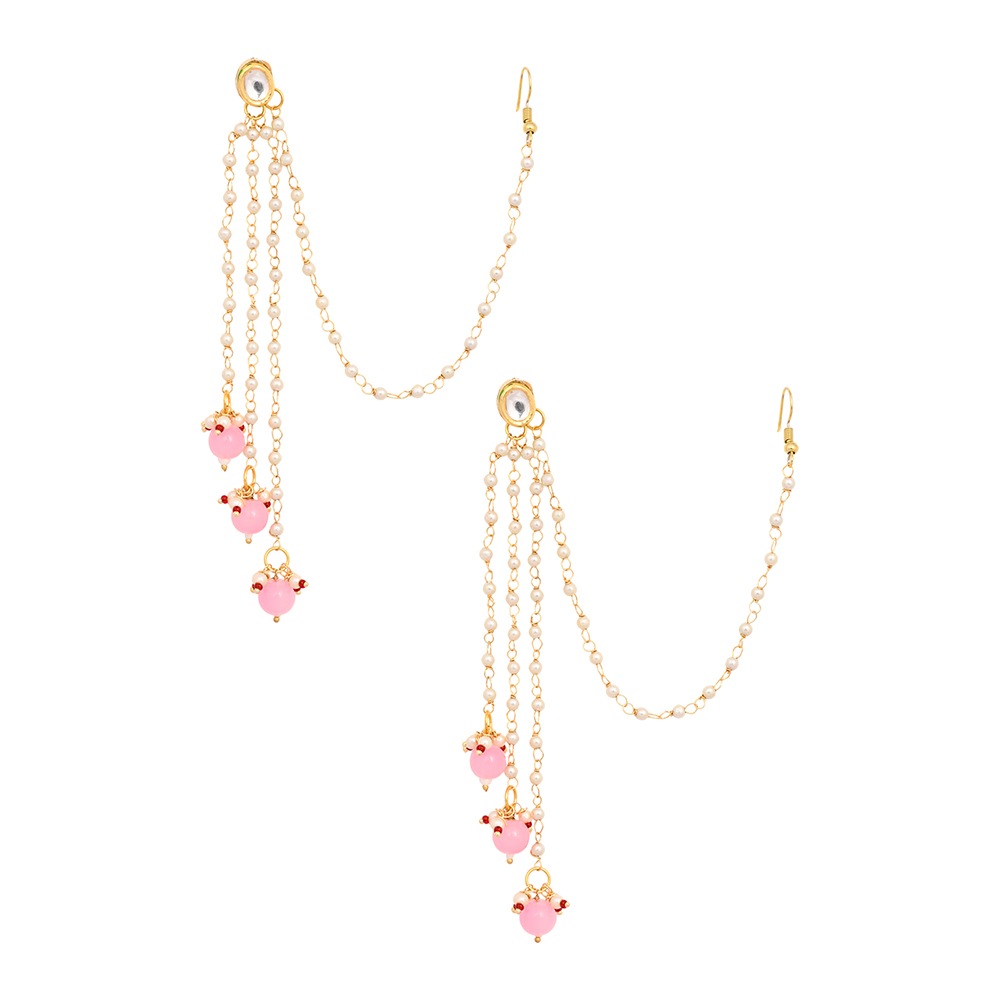 These ear-chain earrings blend mirror stones, pearl chains, and pink bead drops to create a refined yet eye-catching accessory that complements traditional and contemporary ensembles.