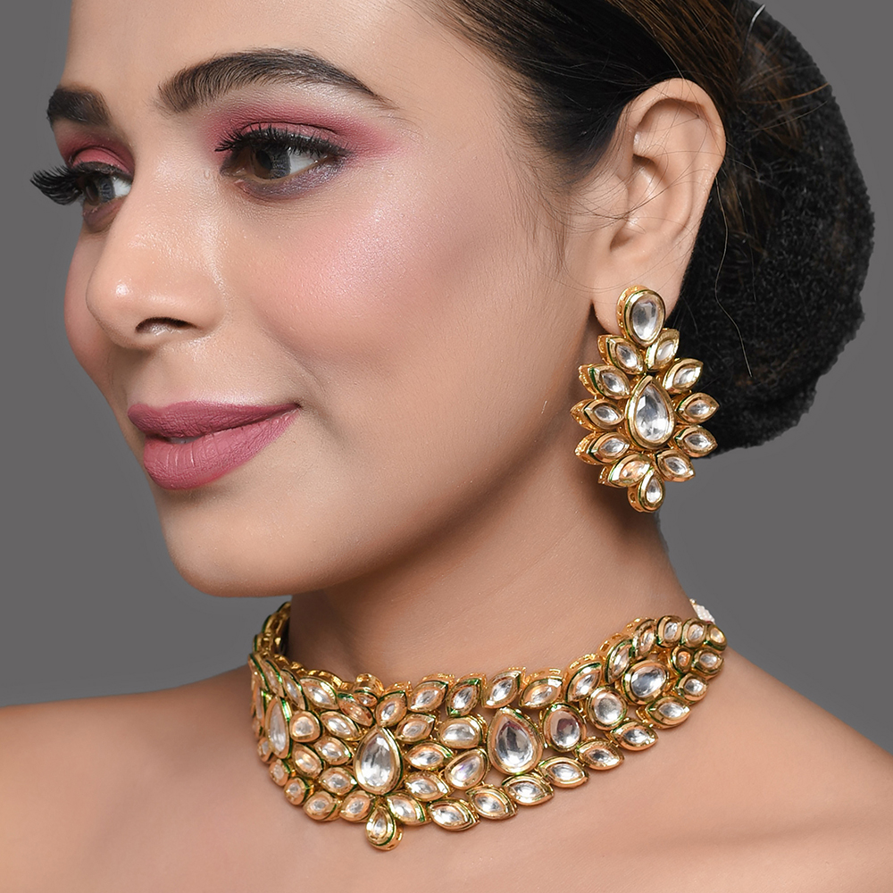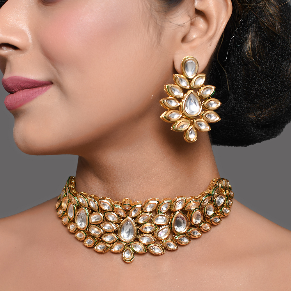 Pair this mirror stone choker set with silk sarees, lehengas, or embroidered anarkalis. Store it in a cushioned jewelry box to preserve mirror clarity and maintain the gold-tone polish.