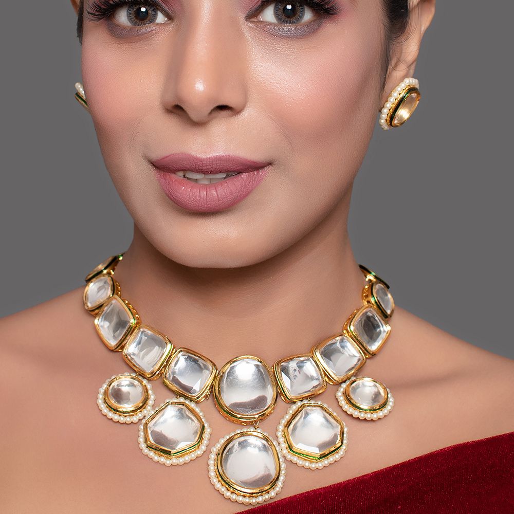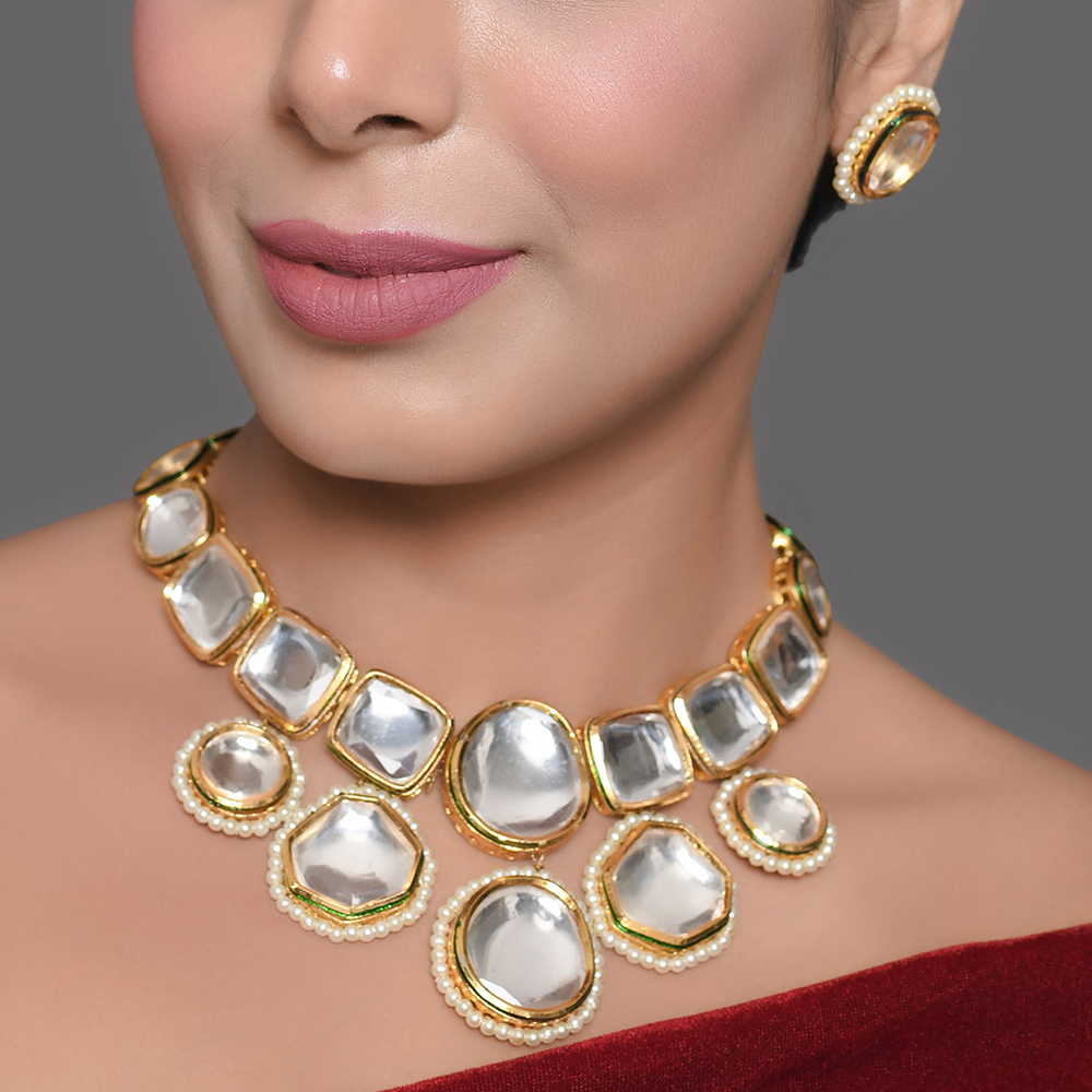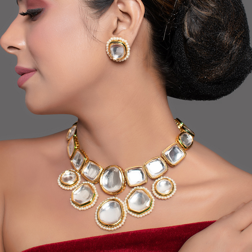 Refined and visually striking, this mirror stone collar necklace set is designed to sit gracefully along the neckline, creating a bold yet elegant statement. The structured collar features polished mirror-style stones framed with delicate pearl borders, paired with matching stud earrings for a balanced and cohesive look. Collar Necklace Set Highlights Carefully handcrafted by skilled artisans, this set blends traditional stone artistry with a clean, contemporary silhouette. Structured collar-style necklace with mirror stone centrepieces Soft pearl border detailing for refined contrast and depth Matching handcrafted stud earrings included Comfortable fit designed for extended wear Crafted using traditional jewellery-making techniques Specs & Materials Material: Metal alloy with mirror-style stones and pearl bead borders Colour: Warm gold tone with reflective silver stones Design: Collar necklace with geometric stone layout and matching studs Origin: Handmade in India and individually quality-checked Each piece may vary slightly due to handcrafted workmanship Necklace features adjustable tie-back for secure fitting Styling & Gift Inspiration Perfect for weddings, receptions, festive events, and formal occasions Pairs beautifully with sarees, lehengas, and contemporary ethnic wear A thoughtful gift for brides, anniversaries, and special celebrations Adds structure and elegance without overwhelming the outfit Care Guide Store the set in a dry pouch and avoid contact with water, perfume, or harsh chemicals. Gently wipe with a soft cloth after use to maintain shine and stone clarity. Artisan Craftsmanship This jewellery set is fully handcrafted using time-honoured techniques. All pieces are handmade never machine-made ensuring individuality and refined artisanal character.
