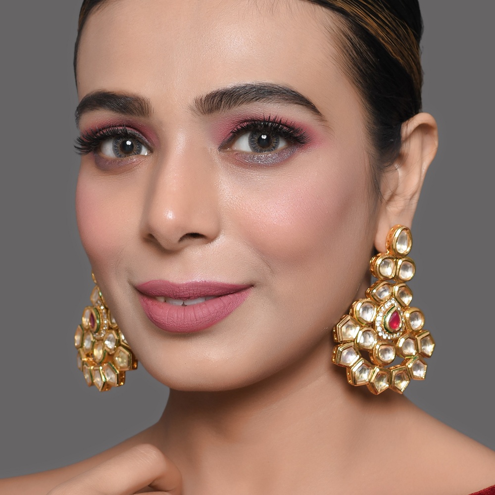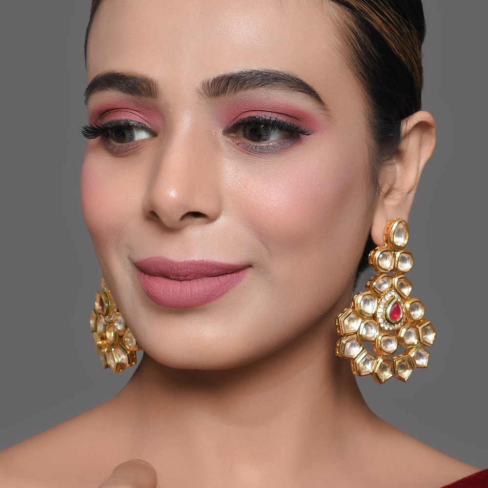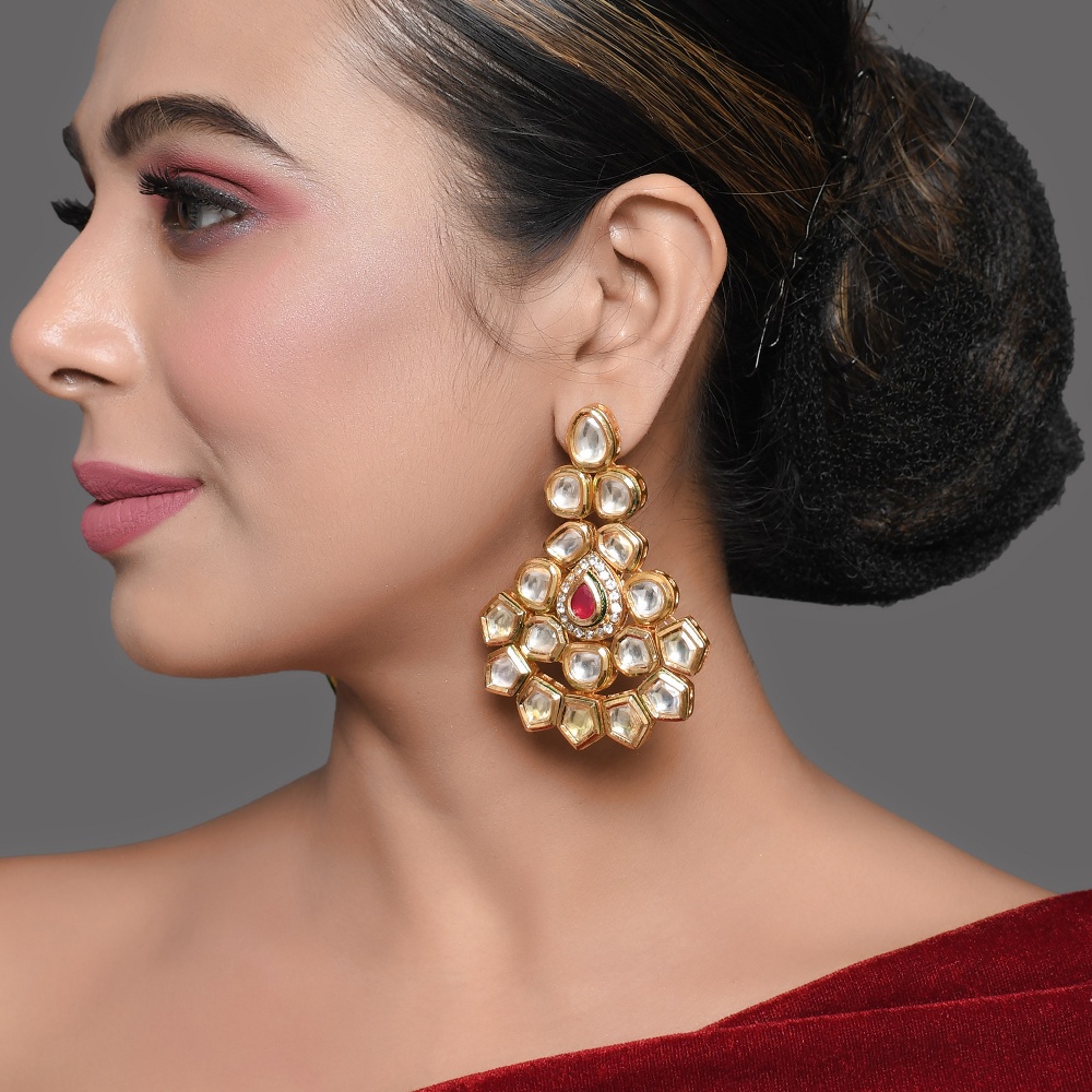 Bold and refined, these mirror stone statement earrings are designed to make a striking impression at weddings and festive occasions. The layered geometric silhouette is highlighted with reflective mirror-style stones and a rich ruby-coloured centre accent, creating depth, symmetry, and a regal focal point. Statement Earring Highlights Carefully handcrafted, these earrings balance traditional artistry with a powerful, eye-catching design. Statement drop earrings with mirror-style stone detailing Ruby-toned centre accent framed with crystal highlights Layered geometric arrangement for visual depth and richness Comfortable structure suitable for extended festive wear Made by skilled artisans using traditional jewellery techniques Specs & Materials Material: Metal alloy with mirror-style stones and coloured stone accent Colour: Warm gold tone with reflective clear stones and red centre highlight Design: Structured statement earrings with layered stone placement Origin: Handmade in India and individually quality-checked Each piece may show slight variation due to handcrafted workmanship Ideal for bridal and festive styling Styling & Gift Inspiration Perfect for weddings, receptions, and traditional celebrations Pairs beautifully with chokers, collar necklaces, and bridal sets An elegant gift for brides and special occasions Adds richness without overpowering the overall ensemble Care Guide Store the earrings in a dry pouch and avoid contact with water, perfume, or harsh chemicals. Gently wipe with a soft cloth after use to maintain shine and stone clarity. Artisan Craftsmanship Each earring is assembled entirely by hand. All jewellery is handmade never machine-made ensuring individuality and refined artisanal quality.