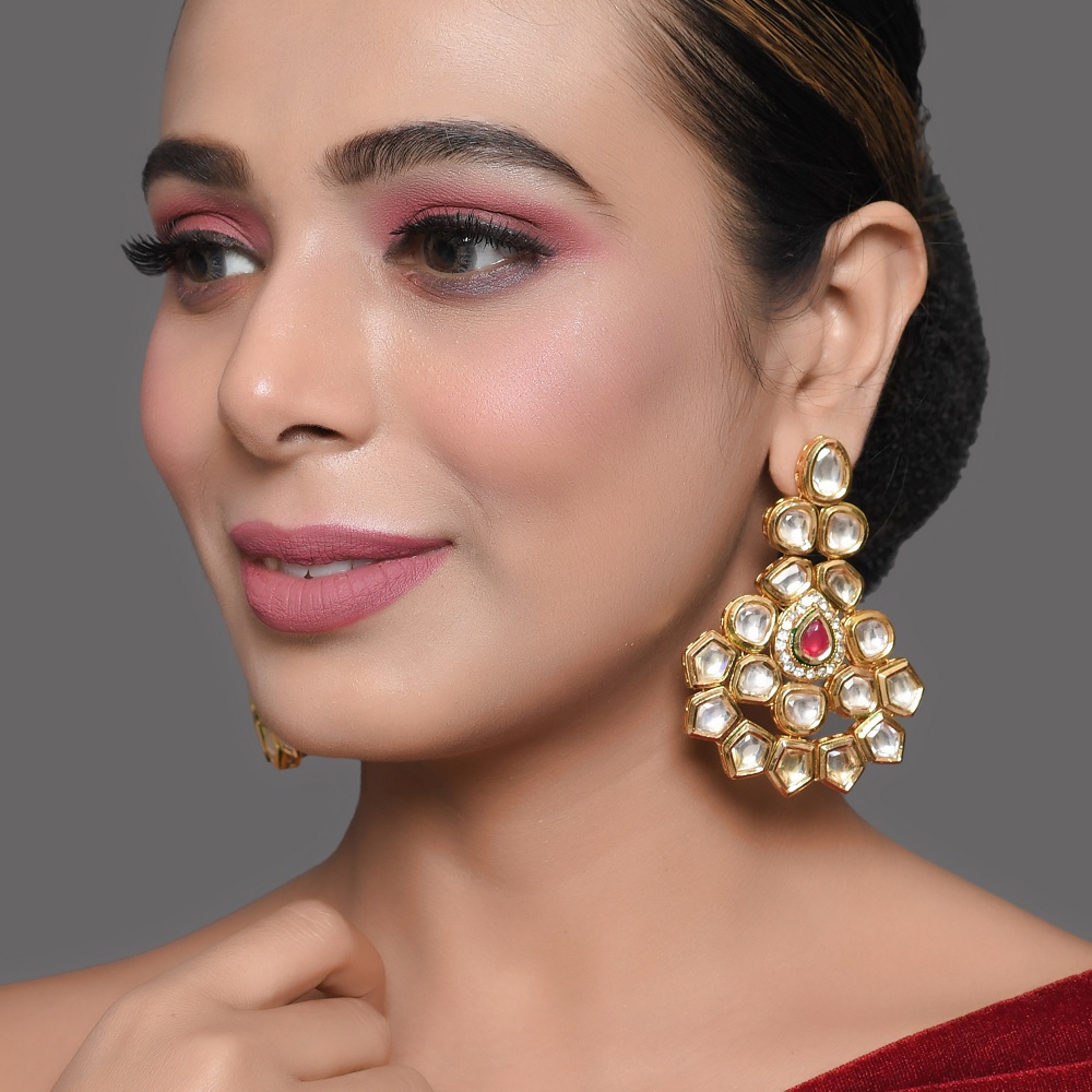 The Mirror Stone Statement Earrings with Ruby Accent Center are designed to command attention with their bold silhouette and luminous detailing. Crafted in golden brass and adorned with radiant white mirror stones, each piece is crowned with a rich ruby-toned center accent that adds depth and contrast. The intricate layout reflects traditional Indian artistry while offering a contemporary festive appeal. Perfectly sized for impact, these earrings blend grandeur with wearable comfort.