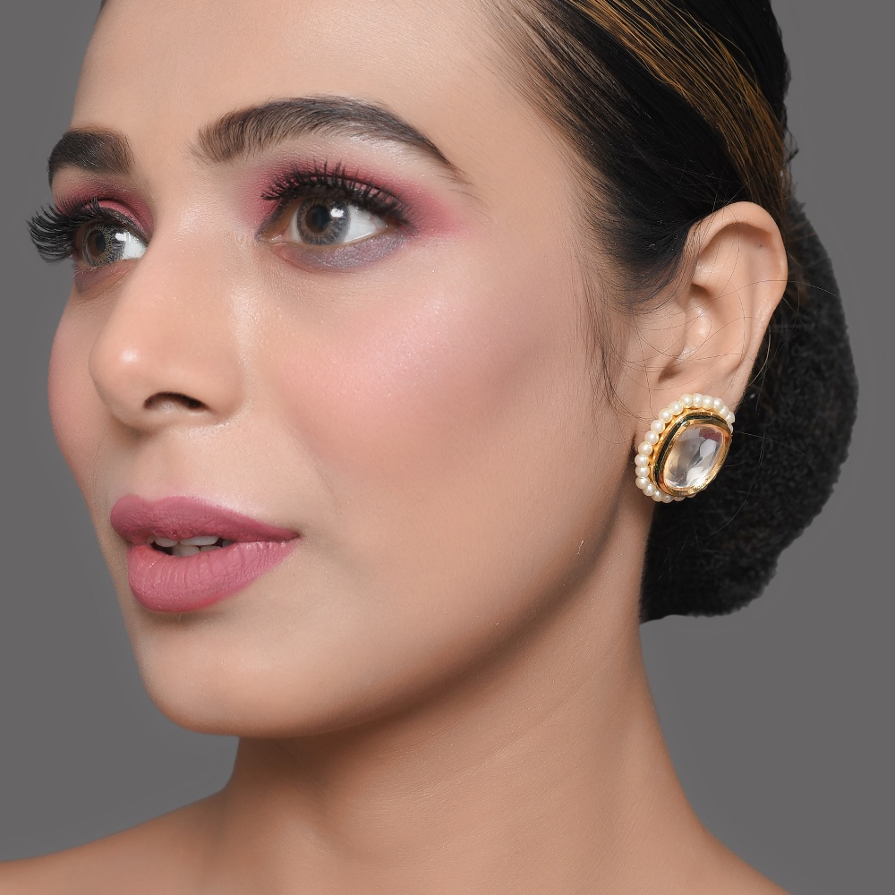 The Mirror Stone Stud Earrings with Pearl Border Finish bring refined elegance to everyday and festive styling. Crafted in brass with a warm gold-tone base, these compact 0.50-inch studs feature a central mirror stone that reflects light beautifully. Encircling the mirror is a delicate pearl border that softens the shine with a touch of timeless grace. Designed for versatility, these studs deliver understated brilliance in a classic silhouette.