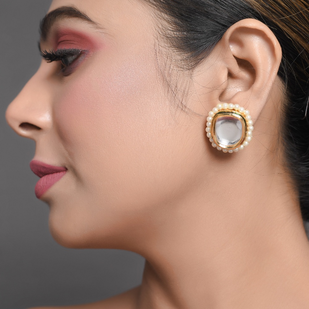 Elegant and understated, these mirror stone stud earrings are designed for women who appreciate refined traditional accents in a compact silhouette. Featuring a polished mirror-style stone framed with a delicate pearl border, this pair offers timeless charm suitable for both festive and everyday ethnic styling. Stud Earring Highlights Handcrafted with precision, these earrings balance classic detailing with wearable simplicity. Mirror-style stone centre with smooth reflective finish Fine pearl border adding softness and visual depth Stud design ideal for comfortable, all-day wear Lightweight construction with secure backing Crafted by skilled artisans using traditional techniques Specs & Materials Material: Metal alloy with mirror-style stones and pearl beads Colour: Warm gold tone with clear stone and white pearl accents Design: Oval stud earrings with bordered detailing Origin: Handmade in India and individually quality-checked Each piece may show slight variation due to handcrafted workmanship Suitable for festive, ethnic, and formal occasions Styling & Gift Inspiration Perfect for weddings, receptions, and festive gatherings Pairs beautifully with collar necklaces and statement chokers An elegant gift choice for celebrations and special occasions Adds polish without overpowering the overall look Care Guide Store the earrings in a dry pouch and avoid contact with water, perfume, or harsh chemicals. Wipe gently with a soft cloth after use to maintain shine and clarity. Artisan Craftsmanship Each pair is assembled entirely by hand. All jewellery is handmade never machine-made ensuring individuality and refined artisanal quality.