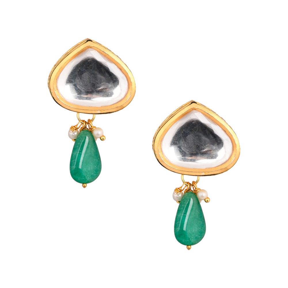 These earrings are handcrafted using a distinctive combination of triangular mirror stones, pearl accents and a green teardrop drop, ensuring each pair is one-of-a-kind and elegant.