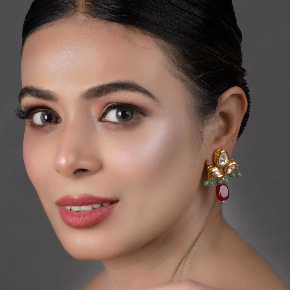 Celebrate vibrant elegance with our handcrafted Mirror Trio Red Stone Drop Earrings with Green Beads. These striking earrings feature a trio of mirrored stones arranged like petals, framed in lustrous gold-tone metal and complemented by clusters of delicate green beads. A bold red stone drop finishes the design, adding a burst of colour and sophistication. Perfect for weddings, festivals and thoughtful gifting, they bring a unique blend of tradition and modern flair to any look.
