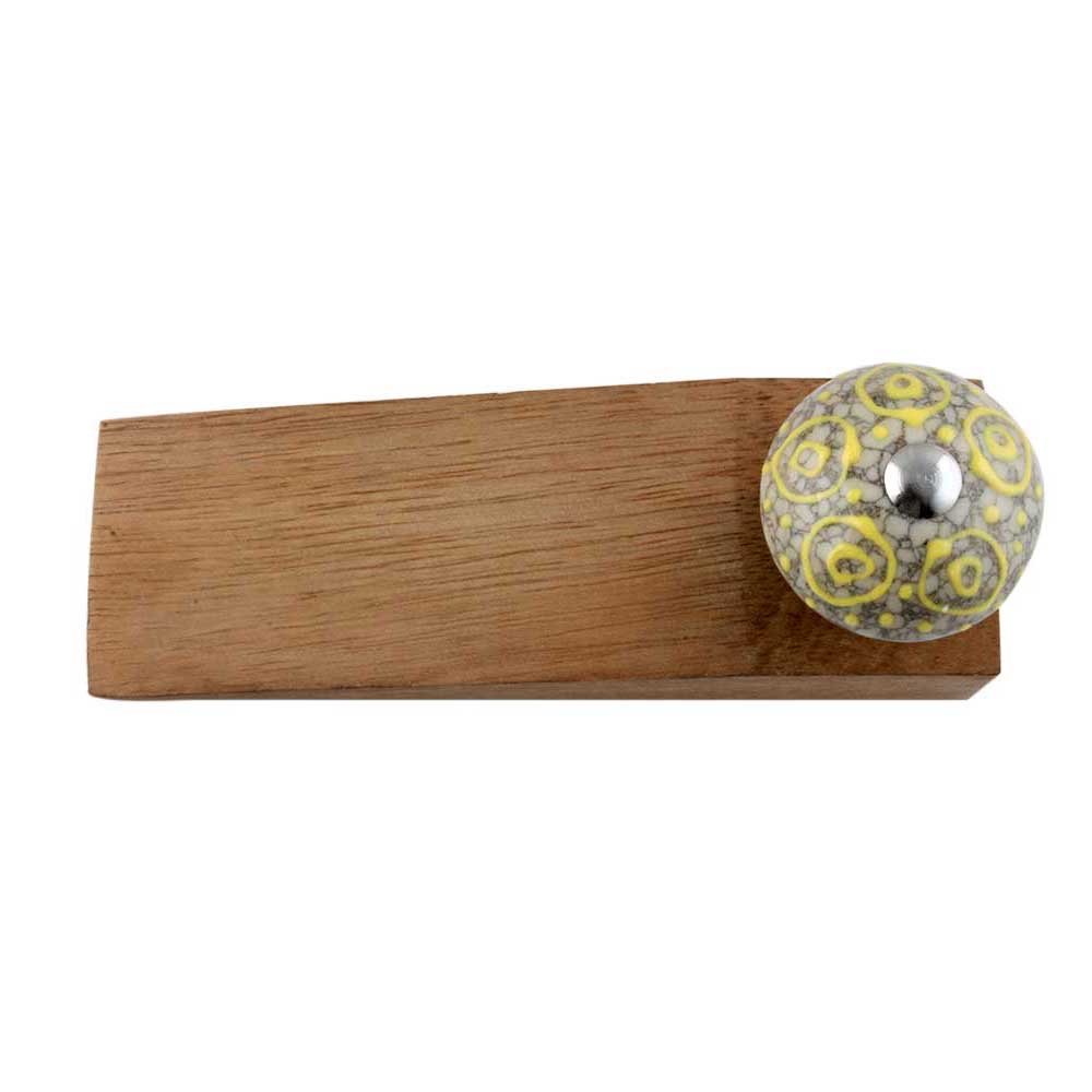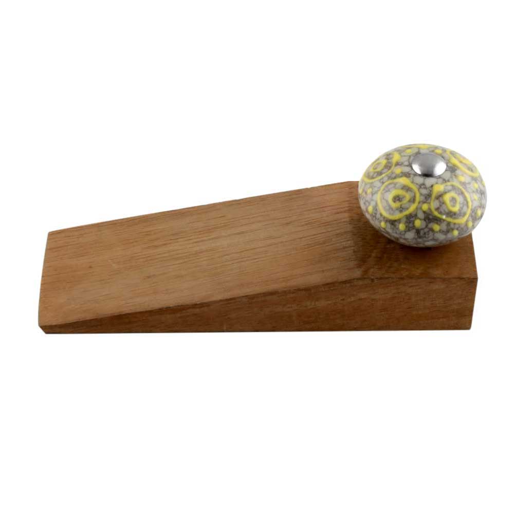 Handmade Ceramic and Wooden Door Stopper.Wooden Door Stopper with a Ceramic Knob to Carry it Easily. This Wooden Door Stopper has Glue Dots under it to Ensure that it does not Slip. It is Handmade by the Craftsmen of India and this Innovative Door Stopper won't Disappoint You.