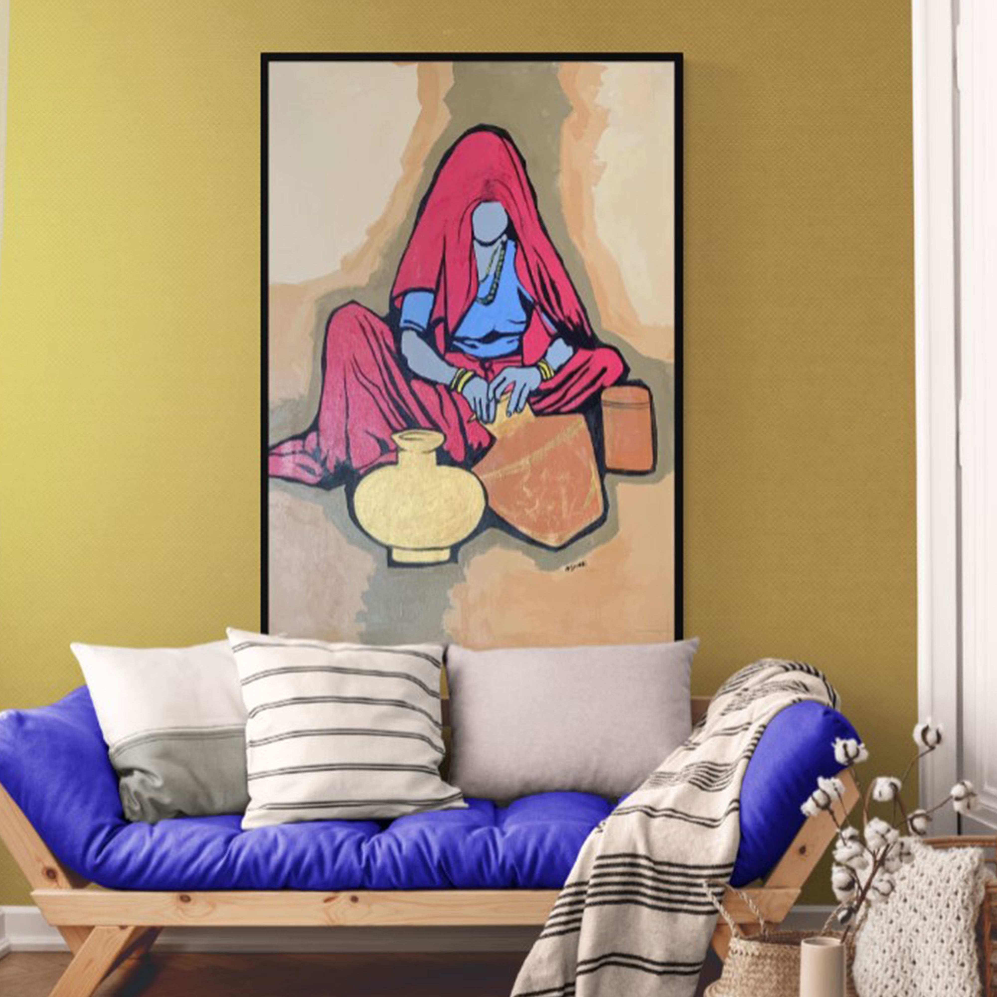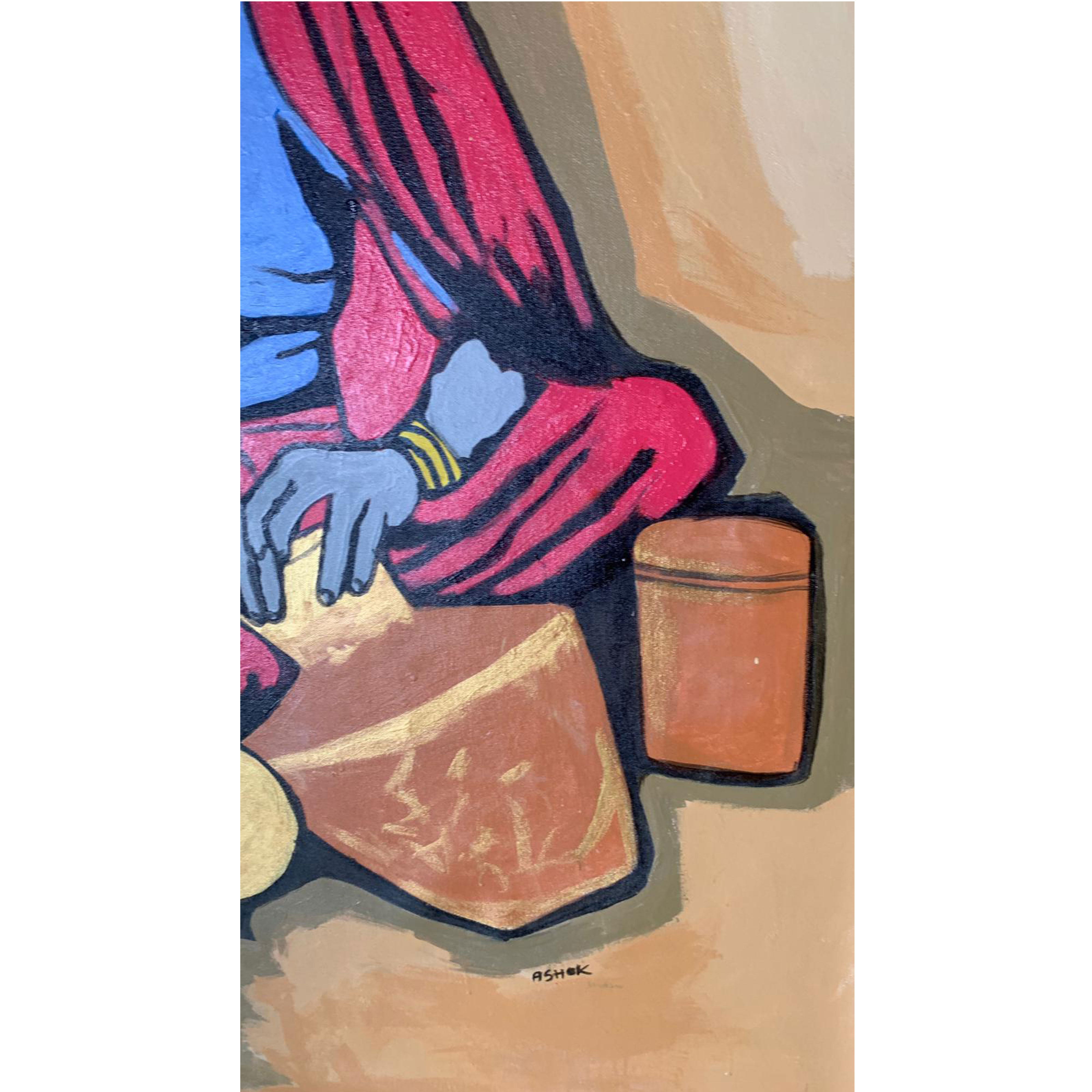 This acrylic painting on canvas portrays a traditional rural scene featuring a woman in vibrant attire engaged in pottery-making. The artist employs bold colors and distinct outlines, bringing attention to the woman who sits gracefully cross-legged on the ground. Her attire, consisting of a vivid blue blouse paired with an eye-catching red saree, adds vibrancy and contrast to the earthy background. Her face remains intentionally featureless, invoking a universal representation of traditional artisans. She wears traditional jewelry, accentuating cultural authenticity. The artwork captures the essence of simplicity, dignity, and everyday beauty of rural life through its expressive color palette and strong graphical style.