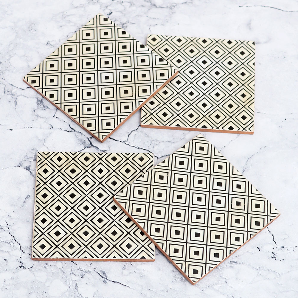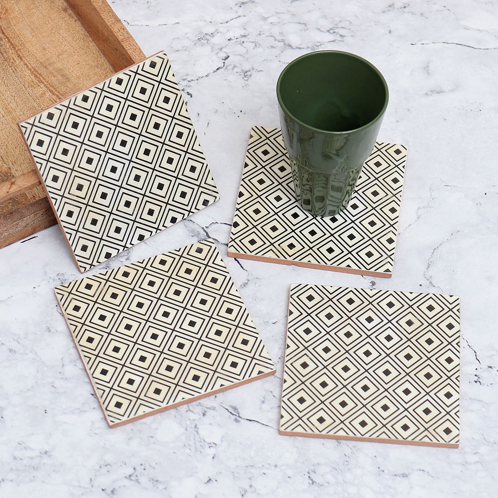 A Pack of 4 wooden tea coasters beautifully handmade by highly talented Indian artisans. Each coaster is made from premium-quality wood, ensuring durability and longevity. The square shape adds a touch of elegance to your home or office decor, while the black and white pattern in an antique finish lends a timeless charm to these coasters. Designed to be both functional and decorative, these wooden tea coasters are perfect for holding water, tea, juice, or coffee glasses, preventing unsightly stains on your surfaces. Whether it\'s at home, in the office, a restaurant, hotel, or cafe, these coasters are versatile companions for any setting. Not only are these coasters a practical addition to your everyday routine, but they also make for a thoughtful gift. Celebrate special or festive occasions by presenting your loved fours with this handmade wooden coaster set, a beautiful and functional piece that will be cherished for years to come.