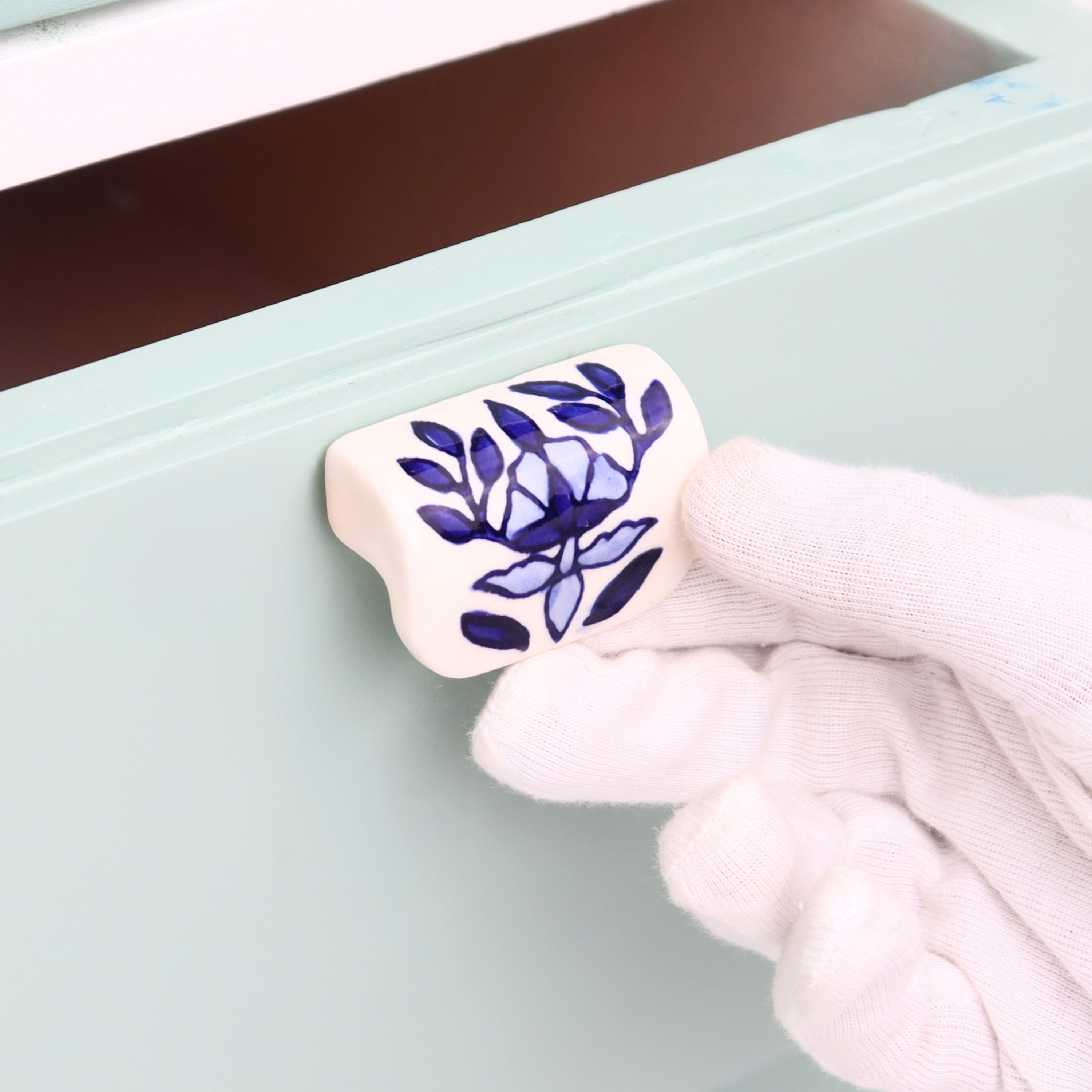 Designed with modern aesthetics in mind, the blue leaf floral pattern combined with the smooth ceramic finish makes this handle a standout addition to any room. Ideal for anyone looking to add a touch of nature-inspired elegance to their kitchen, bathroom, or living room furniture, this drawer handle enhances the visual appeal of cabinets, drawers, and wardrobe doors.