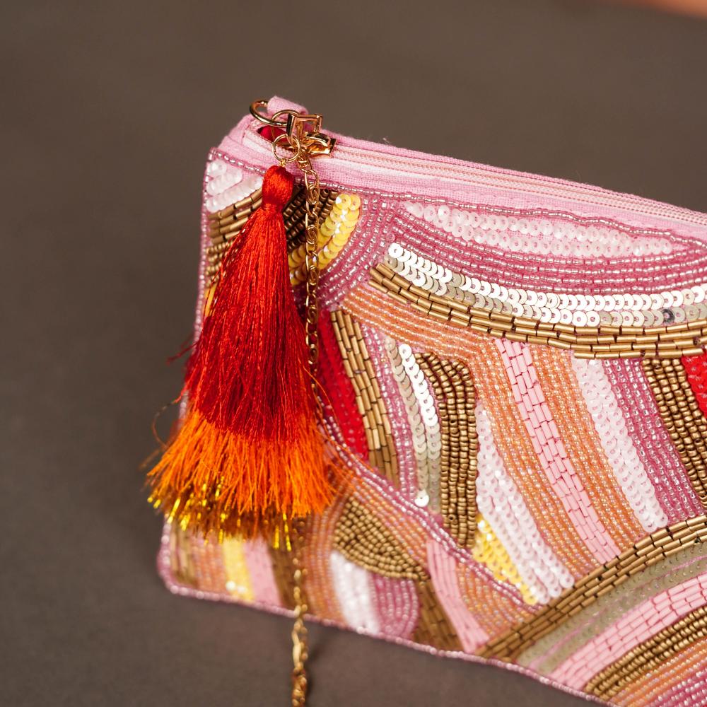 Bold, bright, and unapologetically stylish, this cotton and beads handbag is made for the fashion trailblazer. The striking wave pattern, stitched with glistening beads in hues of gold, blush, coral, and ivory, evokes a modern-retro vibe. It’s a perfect fusion of vintage glamour and contemporary boldness. With a two-tone tassel and metallic chain, this piece is more than just a handbag—it's a wearable work of art.