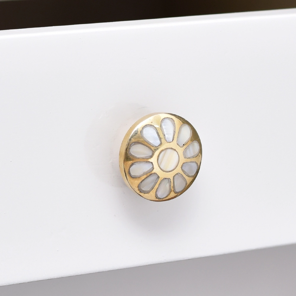 Buy a Mother of Pearl Knob in a pristine white and golden finish and get a hassle free delivery at your doorstep. Meticulously handcrafted by highly skilled Indian artisans, these drawer knobs are a testament to their craftsmanship, combining traditional artistry with a modern twist. These knobs aren't just functional, they're a statement of elegance and sophistication. Perfect for drawers, dressers, cabinets, wardrobes, cupboards, and almirahs in any setting, be it your home, office, hotel, cafe, or shop. The white and golden finish of these cabinet knobs exudes opulence, making them an ideal choice for those who appreciate luxury in the finer details of their decor. These drawer knobs modernize any furniture piece instantly, adding a touch of timeless charm. Looking for the perfect gift? Look no further. These drawer knobs make for a thoughtful and stunning present for your loved ones on special or festive occasions. Whether you're revamping your living space or gifting someone dear, our Mother of Pearl Knob is a testament to beauty and craftsmanship in one.