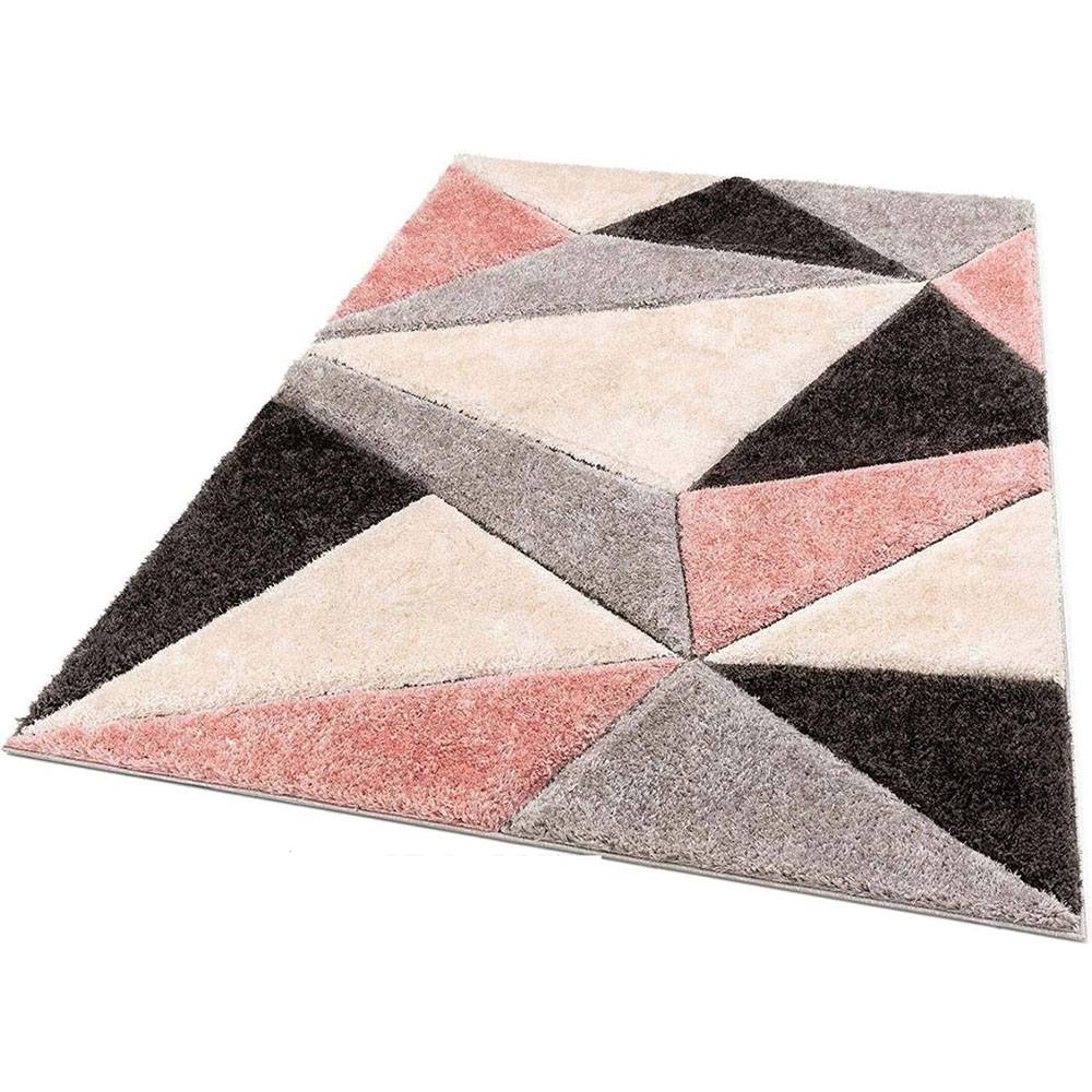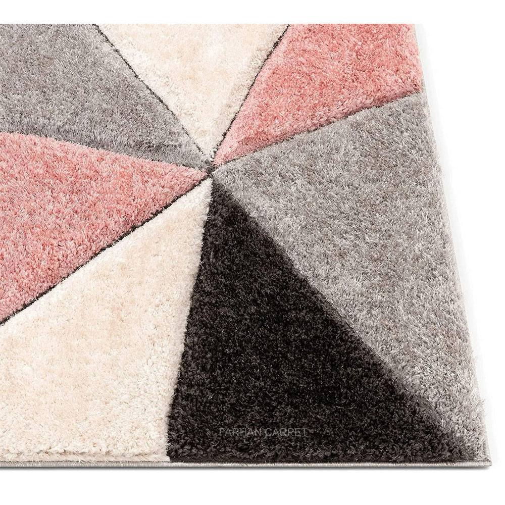 This handmade multicolor polyester rug features a stunning geometric design that blends warm blush pink, grey, black, and cream tones for a stylish yet cozy aesthetic. Perfect for bedrooms, living rooms, or lounge areas. Packed & quality-checked by Indianshelf.