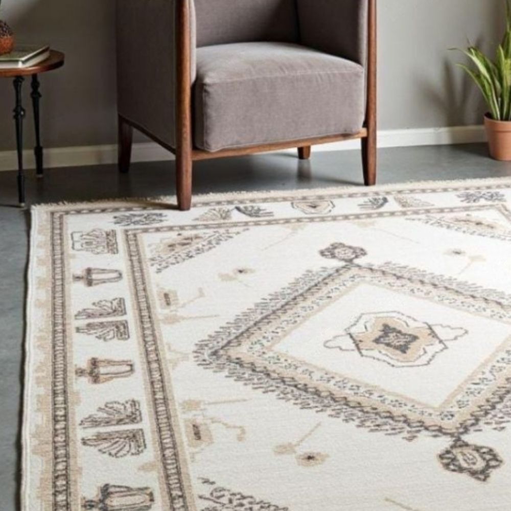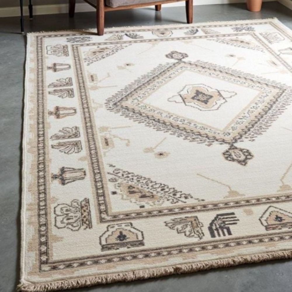 Hand-Knotted Wool Rug Traditional Beige & Brown Geometric Design Transform your home with the elegance of a hand-knotted wool rug, meticulously woven by skilled artisans using centuries-old techniques. Unlike machine-made or tufted rugs, every knot in this rug is tied by hand, making it a true work of art that lasts for generations. Premium Material: Made with natural wool, offering warmth, durability, and a luxuriously soft feel underfoot. Design & Pattern: A classic geometric border design with a central medallion, blending earthy beige and brown tones that complement both modern and traditional interiors. Color Palette: Neutral beige base with subtle taupe, cream, and brown accentsperfect for styling with wooden, bohemian, rustic, or contemporary dcor. Durability: Hand-knotted rugs are known for their strength and longevity; with proper care, this rug can last for decades. Unique & Timeless: Every rug is one-of-a-kind, carrying its own small variations and charm. Size Options Available in multiple standard sizes: Rectangular, Runner, and Custom sizes can also be made on request. Why Choose a Hand-Knotted Rug?