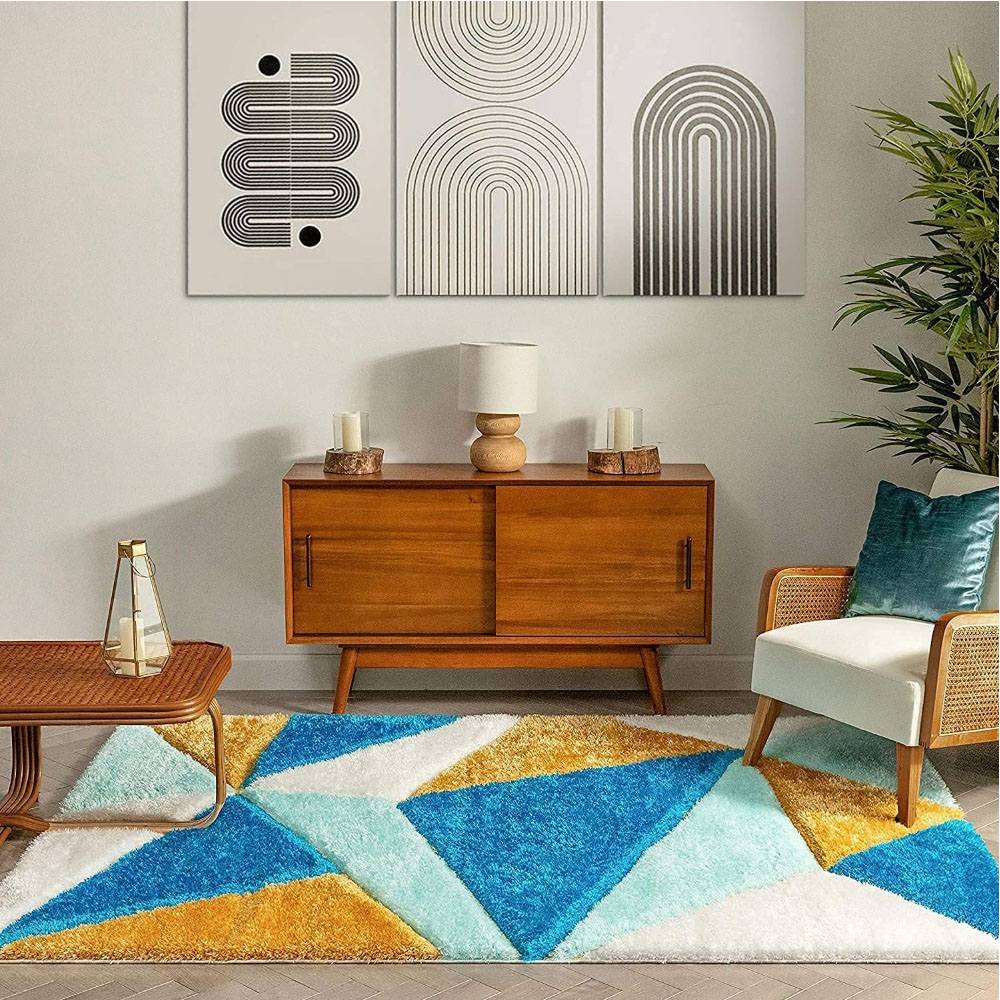 This stunning Turquoise, Mustard, and White shaggy rug crafted from premium polyester combines bold design with modern comfort. The geometric triangle pattern adds structure and energy to interiors, while the soft pile ensures a cozy underfoot feel. Each rug is handcrafted, packed, and quality-checked by Indianshelf artisans.